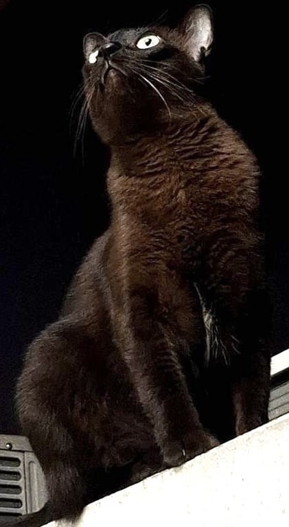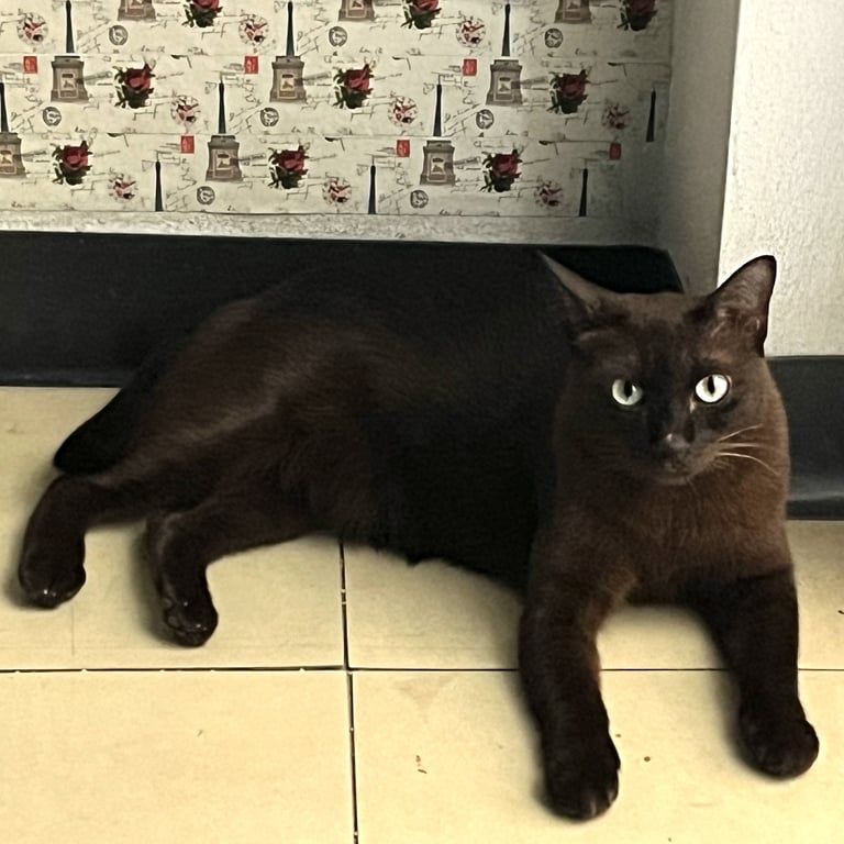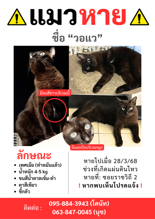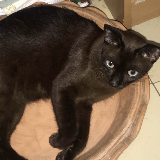 รอยตำหนิ: มีขนสีขาวเล็กน้อยที่ระหว่างช่วงอกก่อนถึงท้อง มีแผลเป็นบริเวณจมูกขนมีลักษณะสีน้ำตาลเข้ม-ดำ ตาสีเขียว น้ำหนัก 4-5 kg อายุ 5-6 ปี นิสัยขี้กลัว