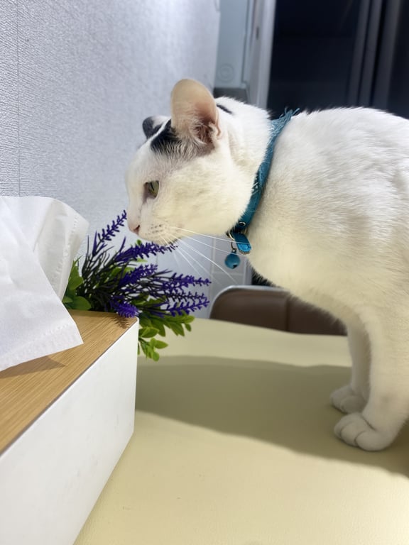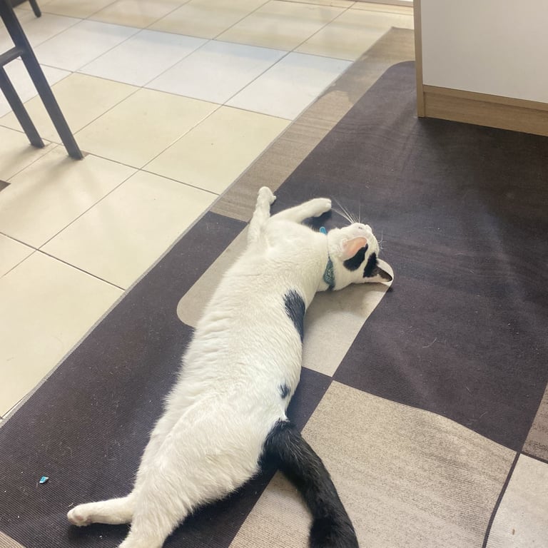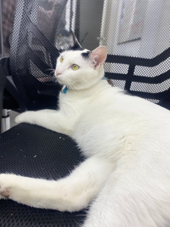 รอยตำหนิ: ปลายหางม้วนเล็กน้อย ด้านหลังมีลายสีดำคล้ายรูปหัวใจใส่ปลอกคอสีฟ้าเป็นผ้าสามเหลี่ยม มีกระดิ่งด้านหน้า นิสัยกลัวเสียงดัง กลัวคนแปลกหน้า