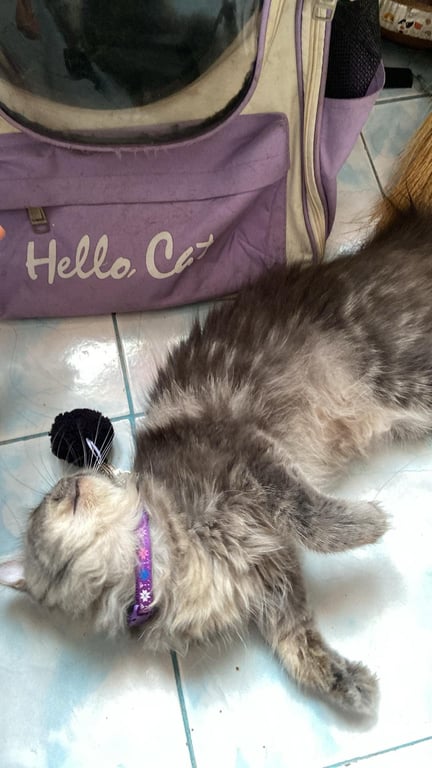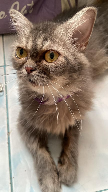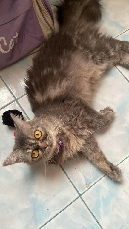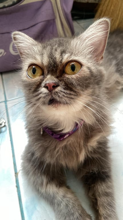 รอยตำหนิ: หน้าผากมีลายสามขีด บริเวณใต้คางถึงท้องมีขนสีขาวม่นๆ ตาสีเหลือง ลำตัวยาว ขนยาวน้องขี้ระแวง ตกใจง่าย เวลาน้องกลัวจะชอบไปนอนที่มืดๆ ไม่ค่อยร้อง น้องเสียงเบา ถ้าน้องกลัวหรือไม่ใจใครน้องจะกัดและข่วน
