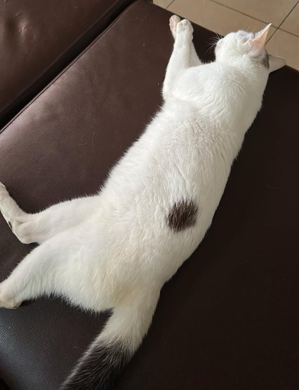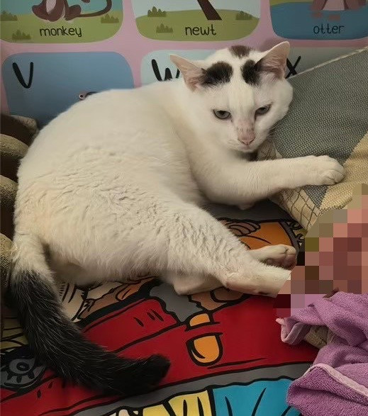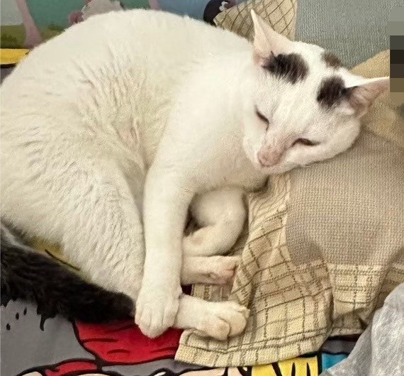 รอยตำหนิ: บริเวณหัวมีวงกลมสีน้ำตาล 3 วง หางมีสีน้ำตาล ลำตัวซ้ายมีวงกลมสีน้ำตาล1 วงไม่ได้สวมปลอกคอ นิสัยดี ขี้กลัว ตอนนี้ป่วยเป็นลูคีเมีย ร่างกายไม่ค่อยแข็งแรง