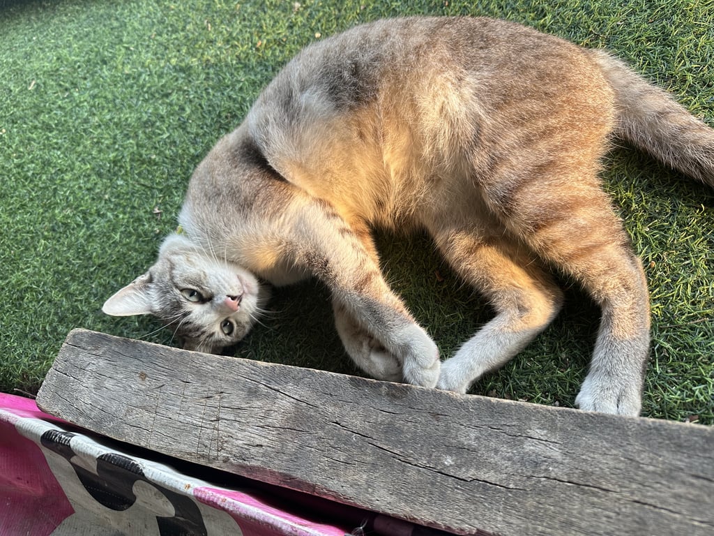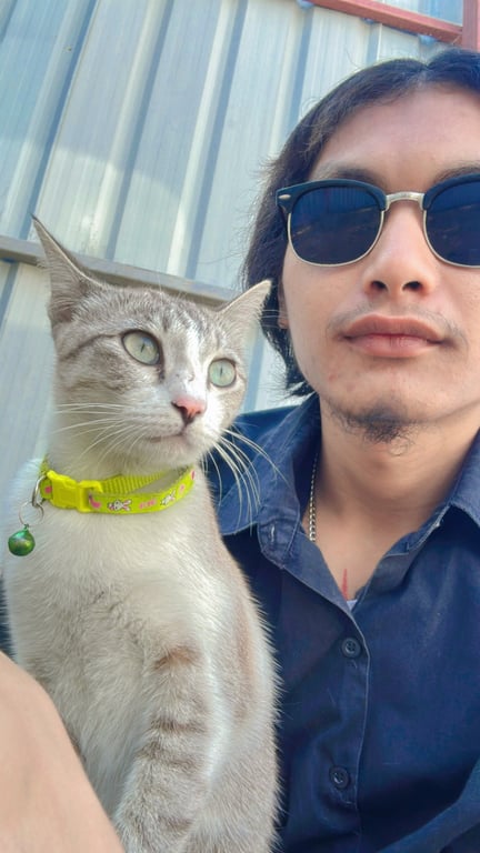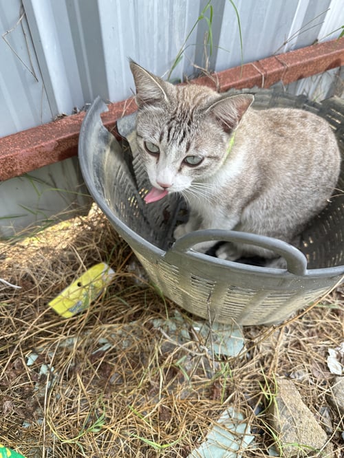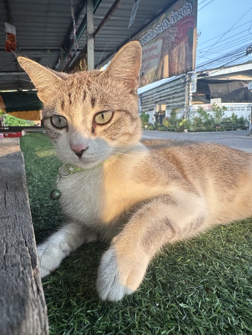รอยตำหนิ: มีขนสีดำที่ปลานหูทั้งสองข้าง ปลอกคอสีเขียวไม่มีกระดิ่งขี้อ้อนไม่กลัวคน