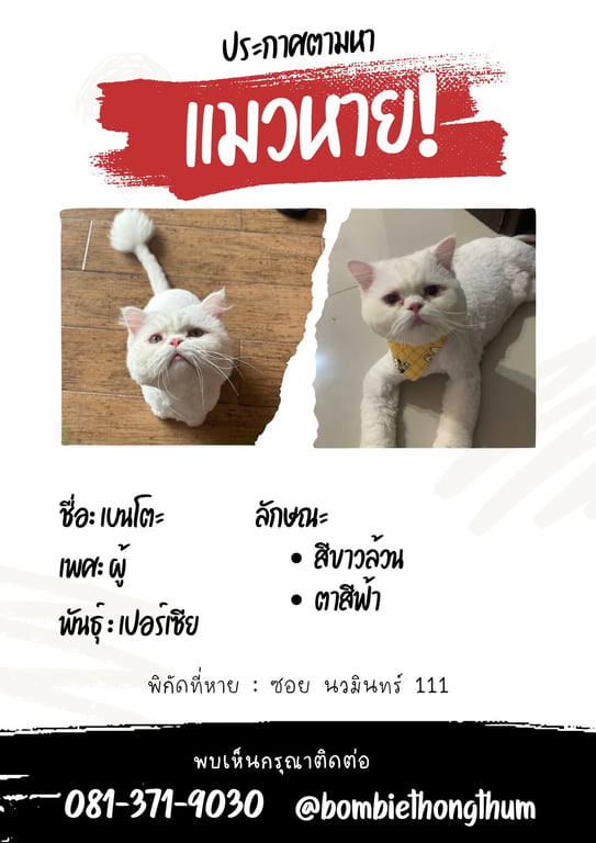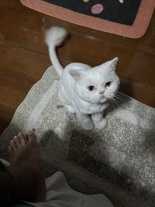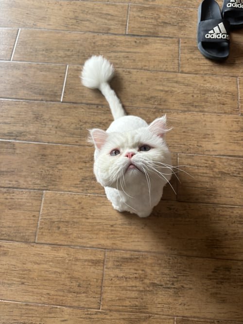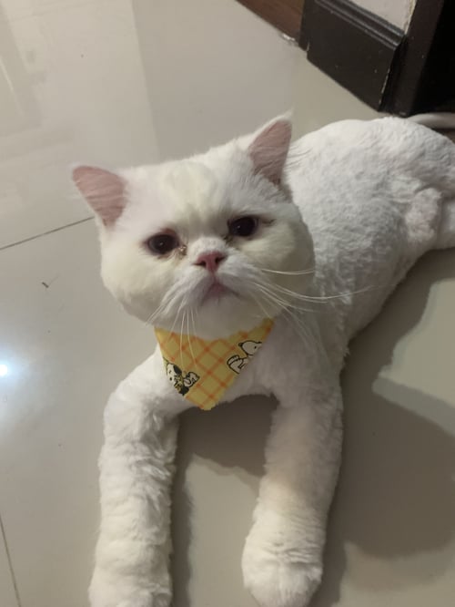รอยตำหนิ: ขนสีขาวล้วน เพิ่งตัดขนได้ไม่นาน ตาสีฟ้า ไว้ขนพุ่มที่หางแบบในรูป