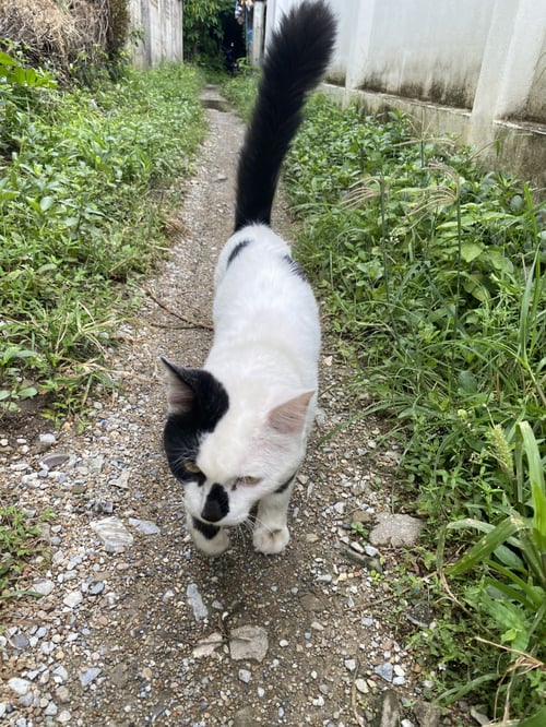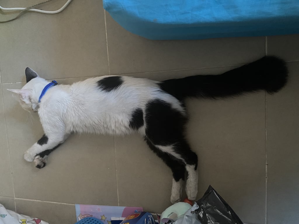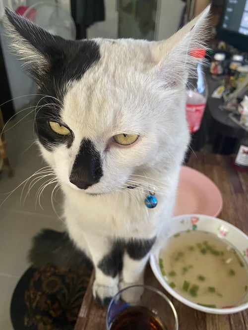 รอยตำหนิ: มีสีดำตรงจมูก หาง หู มีวงกลมสีดำที่หลัง มีเคราสีดำตรงคางไม่ดุ คนอื่นจับได้ จะดุกับแมวด้วยกัน
