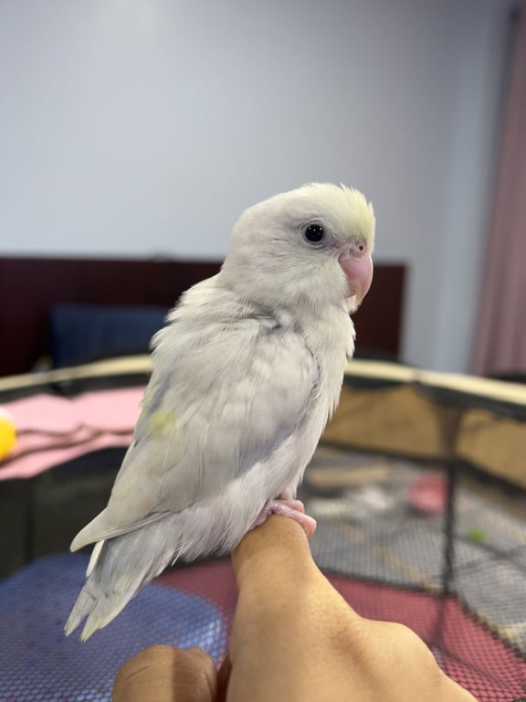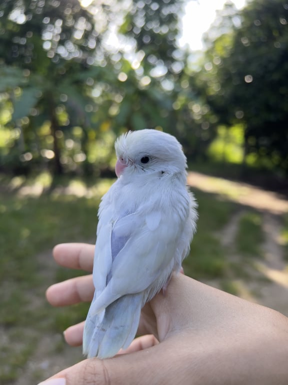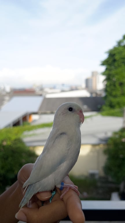 รอยตำหนิ: มีปลอกขายางสีฟ้า อีกข้างปลอกห่วงน้องคนข้างตื่นคน ขี้ตกใจ ตัวเล็กกว่าปกติ หน้าผากสีเหลืองอ่อน ลำตัวสีขาว หลังสีม่วงอ่อน