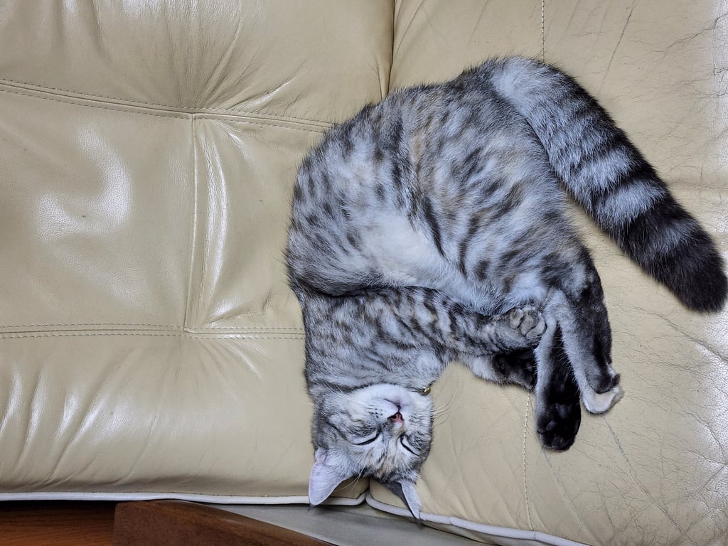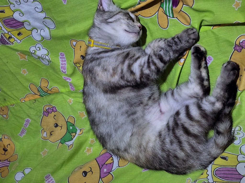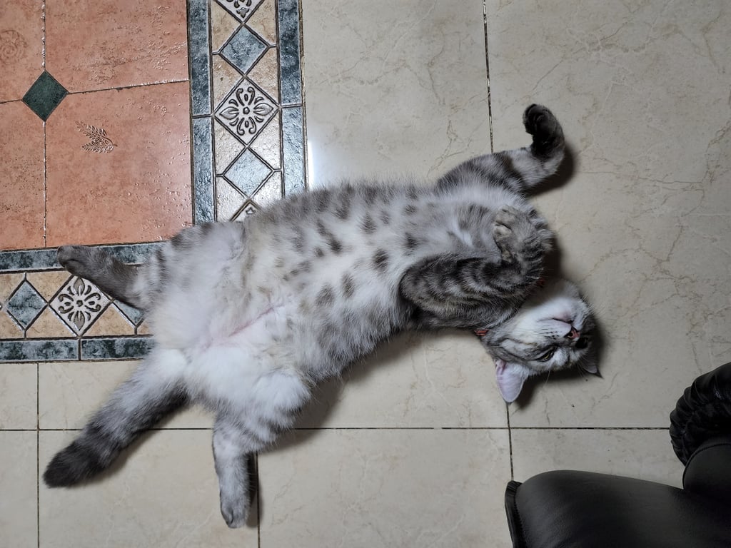 รอยตำหนิ: มุมหัวตา มีสีดำ กลางหน้าผากสีออกส้มพันธุ์ผสม เปอร์เซีย กับ อเมริกันช็อตแฮร์ เป็นแมว 3 สีโทนขาวดำเทา