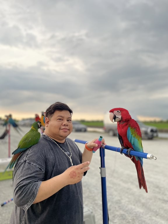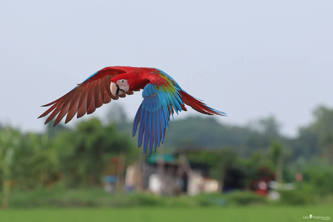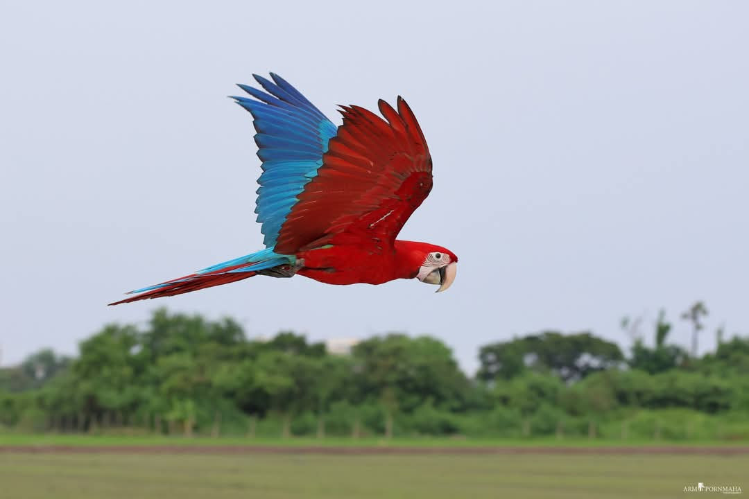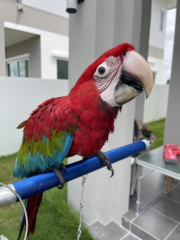 รอยตำหนิ: ปากล่างขาวนกกรีนวิงมาคอว์สีแดงตัวใหญ่ ร้องเสียงดัง อ๊ากๆ มีเลขทะเบียนไมโครชิพแล้ว