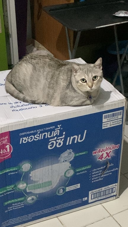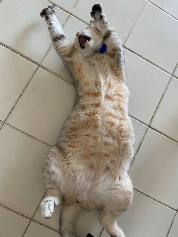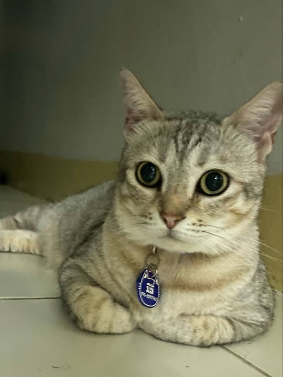 รอยตำหนิ: ตรงกลางหลังมีขนสีดำน้ำตาลแซมๆ ใส่ปลอกคอมีชื่อและเบอร์โทรขี้กลัว ชอบนั่งหมอบๆ