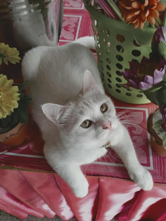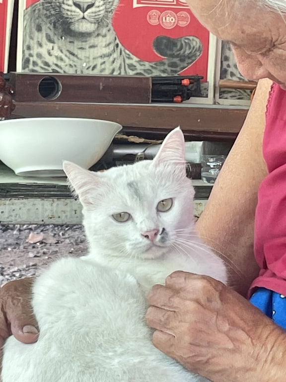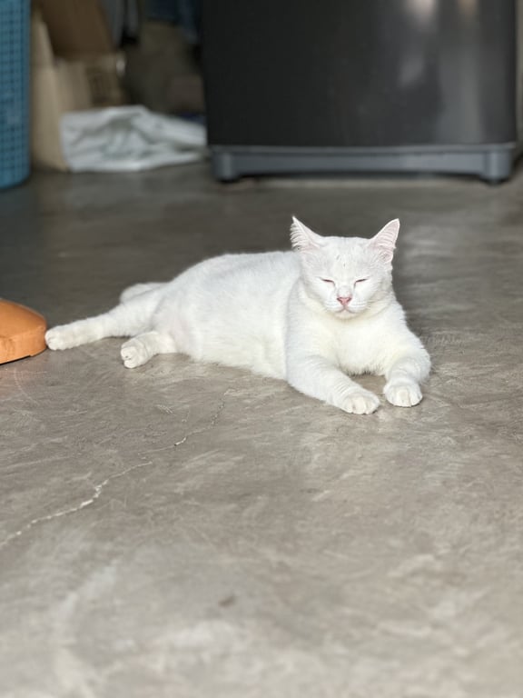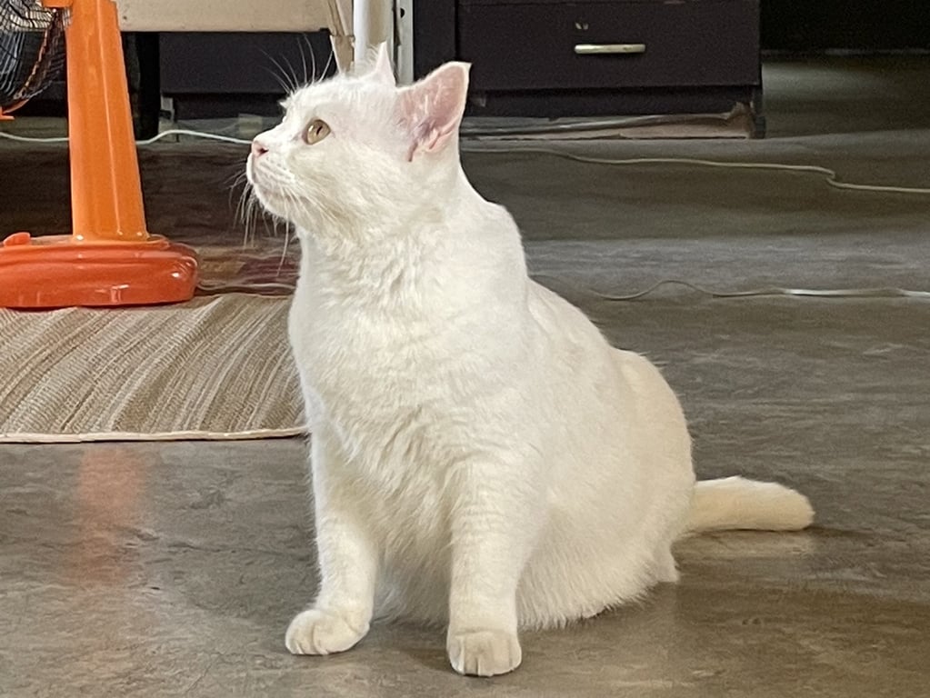 รอยตำหนิ: สีขาวล้วน ขาสั้น พุ่งย้อยขี้กลัว ไม่ค่อยเข้าหาคน