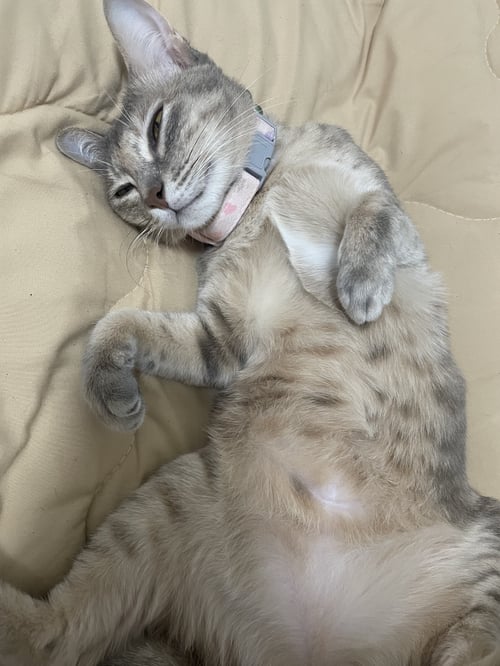 รอยตำหนิ: ใส่ปอกคอสีชมพู มีกระดิ่งสีเขียวเก่าๆ 2 ลูกใน้ส้นเดียว มีแอร์แท็กรูปเท้าแมวน้องขี้กลัวมากๆค่ะ กลัวเสียงรถ กลัวคนที่ไม่รู้จัก