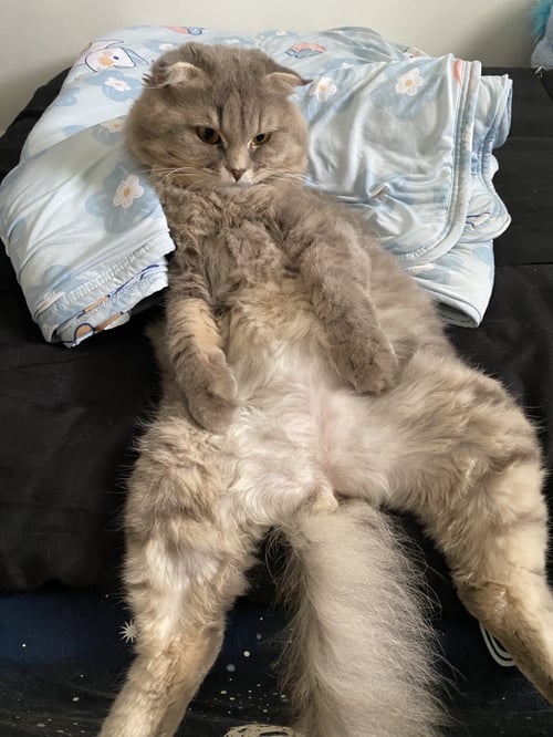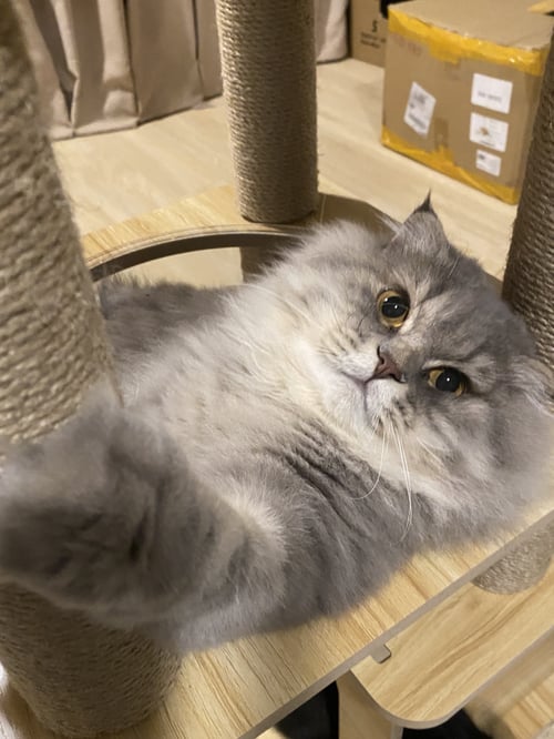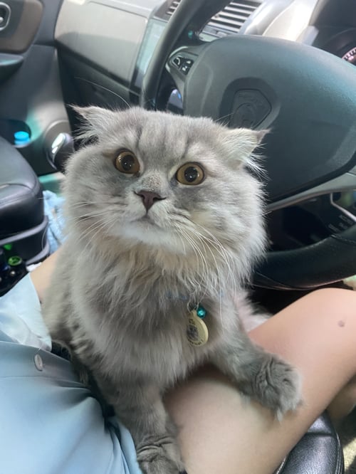 รอยตำหนิ: หูดีดสก็อตติช โฟลด์ ขนยาว หูดีด สีเทา-ขาว ติดเหลือง รอบปากสีขาว นิสัยขี้กลัว ไม่ดุ จับตัวได้