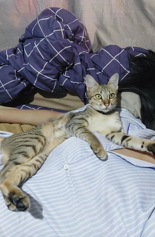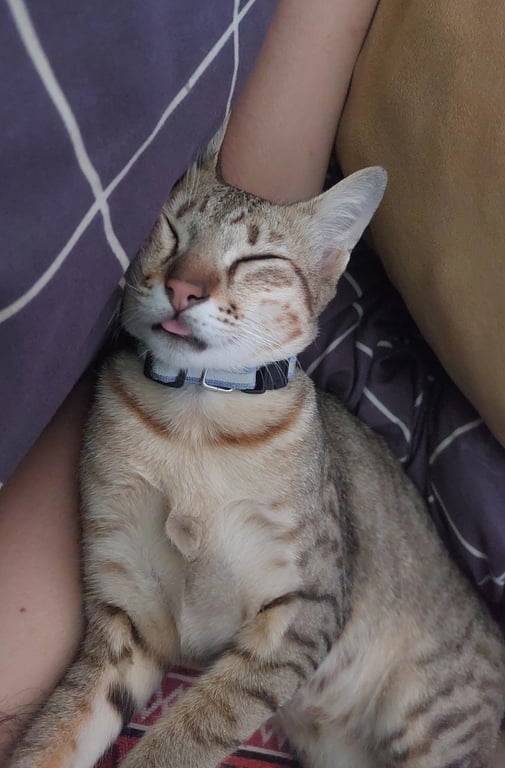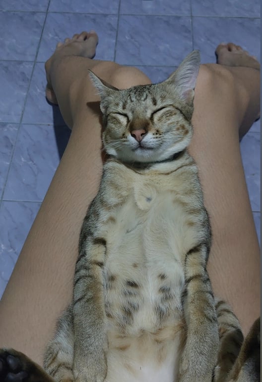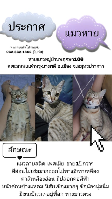 รอยตำหนิ: ตรงหน้าอกจะมีขน วนๆแมวลายสลิดสีจะออกเทา-เหลือง ตรงหน้าอกสีมีขนสีครีมๆ ลายท้องเหมือนปลาเผา สวมปลอกคอสีฟ้าเรืองแสง เชื่องมาก ได้ยินเสียงเขย่ากระปุกอาหารจะรีบวิ่งมาหาทันที