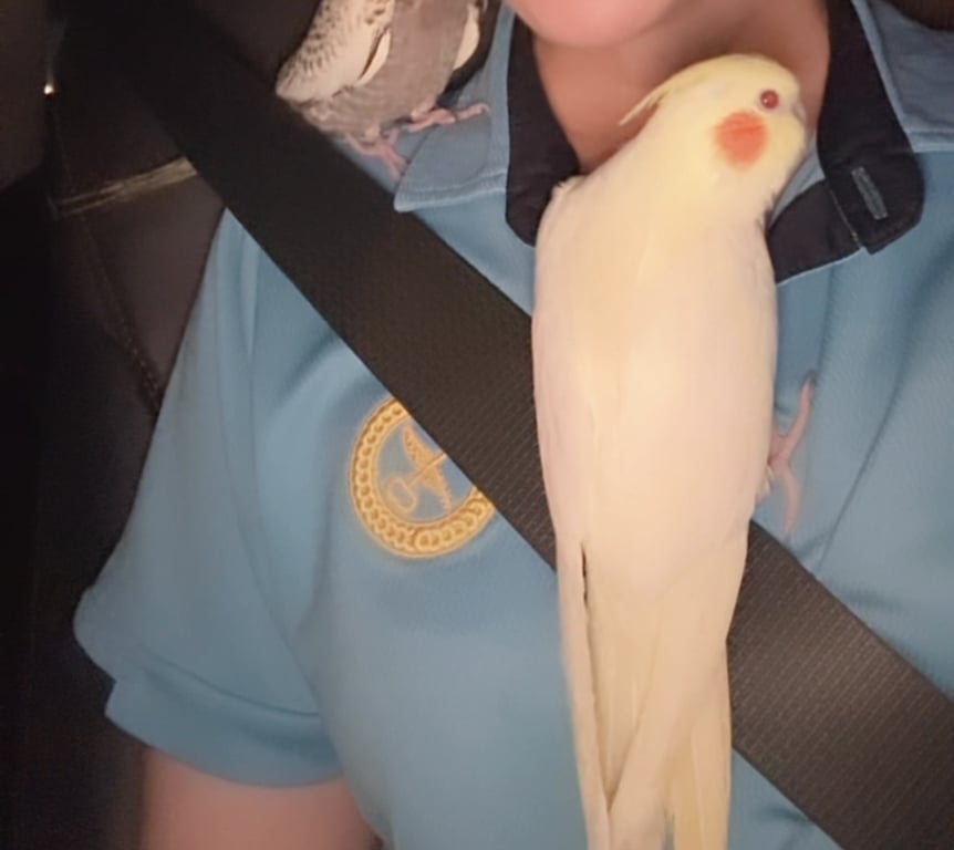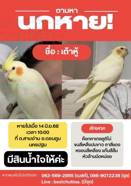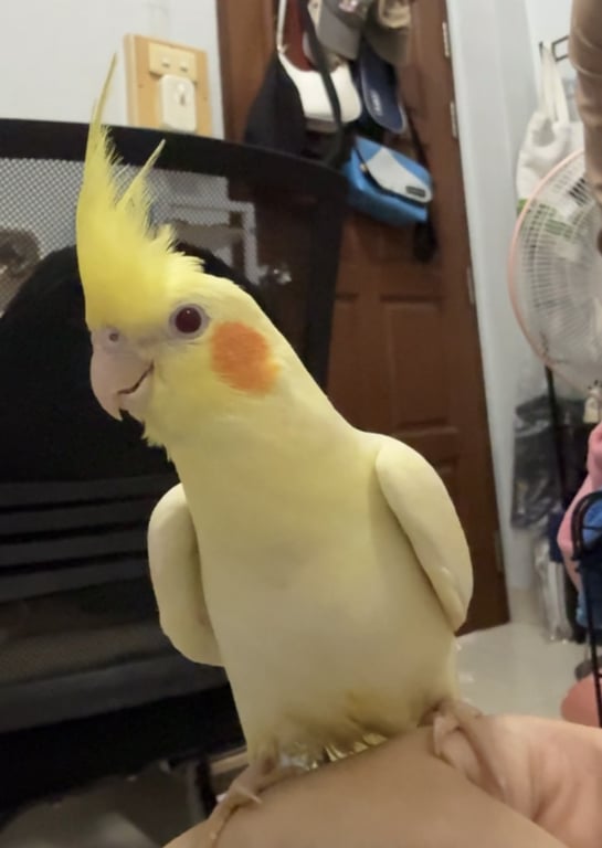 รอยตำหนิ: ตัวสีเหลือง แก้มสีส้ม หัวล้านนิดหน่อย ไม่มีห่วงขาชอบให้กอด เกาหัว