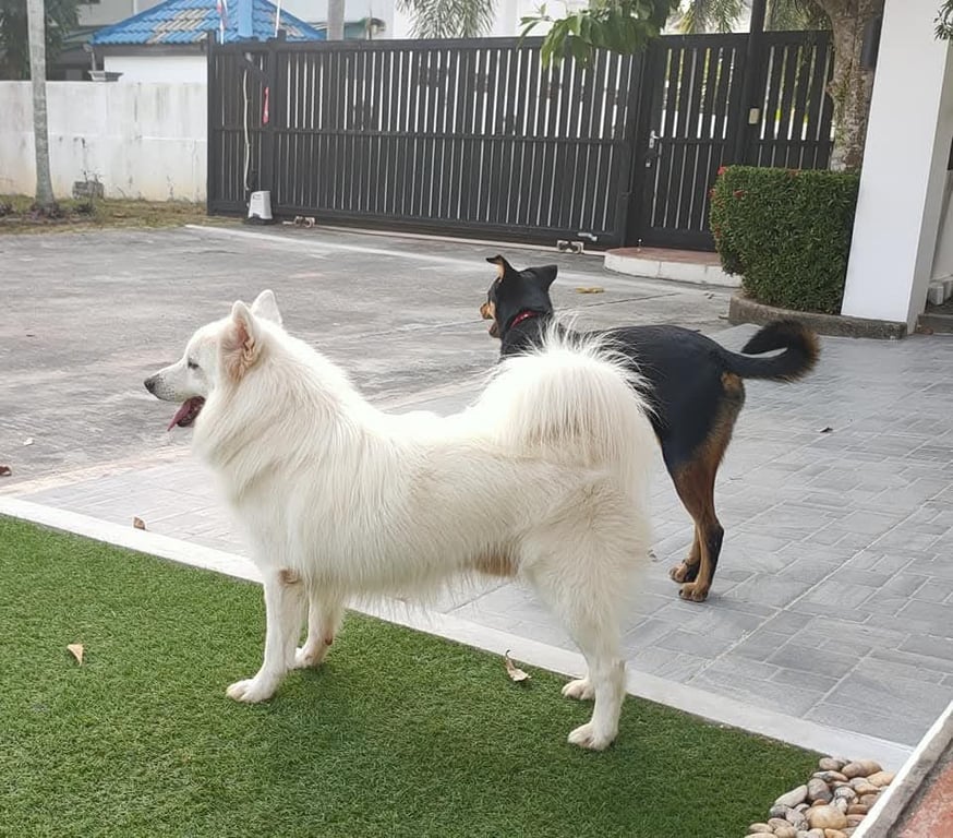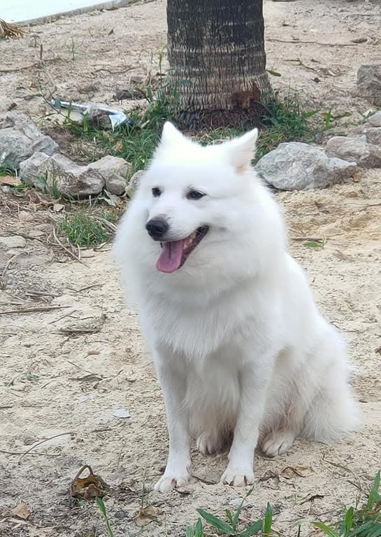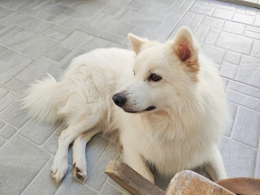 รอยตำหนิ: จมูกสีชมพูด่างดำอายุ 5 ปี ปลอกคอสีส้ม