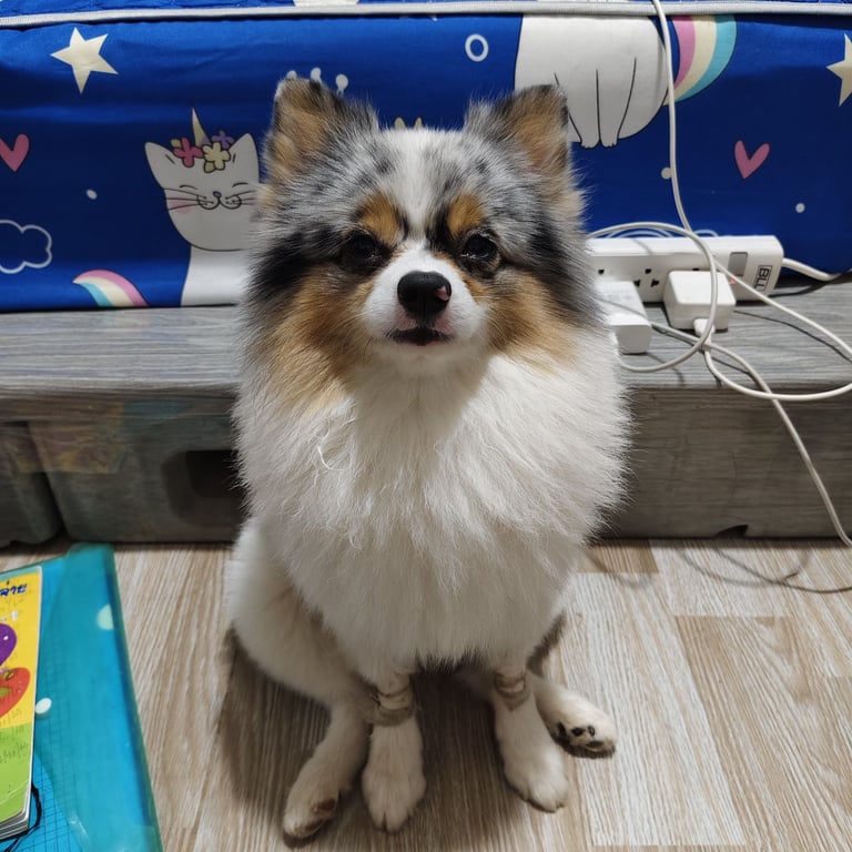 รอยตำหนิ: มีแผลที่ขาหน้า 2 ข้าง หน้าคล้ายบางแก้ว ลายหน้าเหมือนใส่เเว่นตัวเล็ก ขนฟู หนักประมาณ 4.2 กิโล ชอบเข้ามุม ชอบเห่า แต่ไม่กัด มีของกินล่อคือยอมทุกอย่าง ชอบอยู่เงียบๆ
