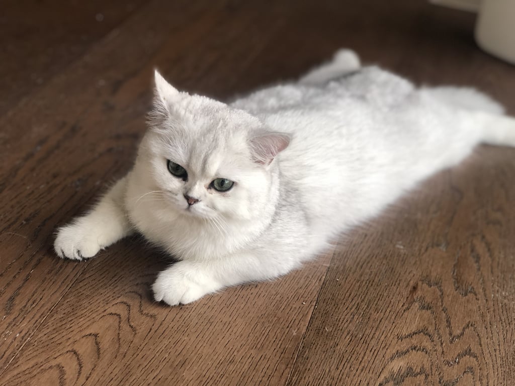 รอยตำหนิ: ตาสีฟ้า ขนสีขาวมีสีเทาดำแซมขนสีขาว ตาสีเขียว ขี้กลัว ขี้ตกใจ ไม่กัด