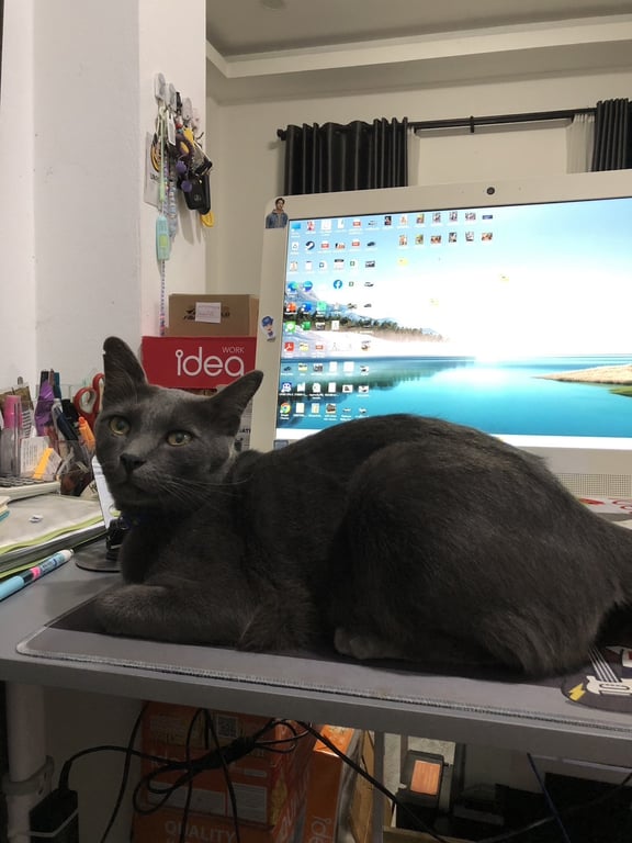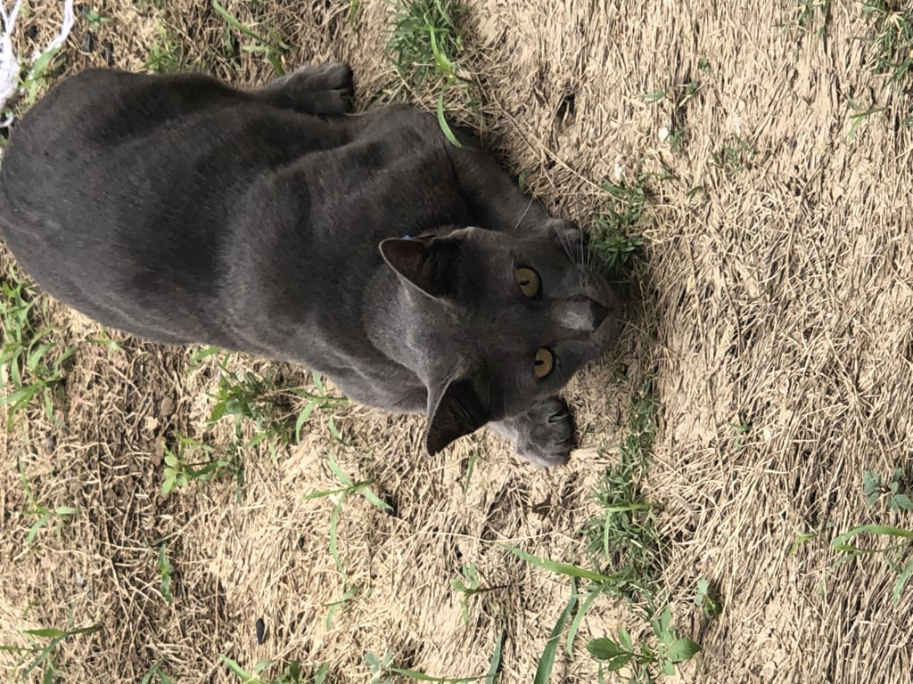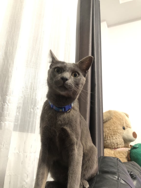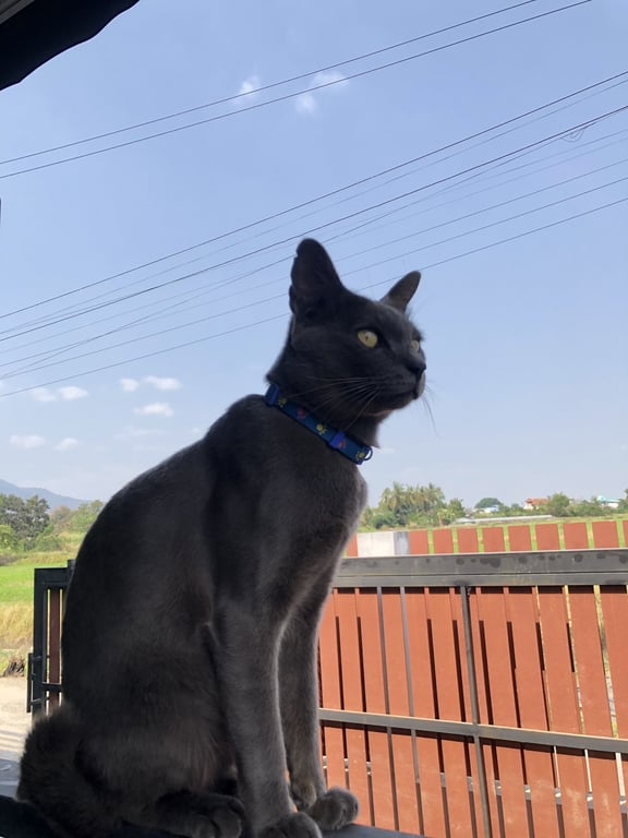 รอยตำหนิ: ปลายหางงอเป็นแมวสีเทาเข้ม มีตำนิหูขวา แหว่างเล็กน้อย ปอกคอน้องมีน้ำเงิน ตัวอ้วยพอดี