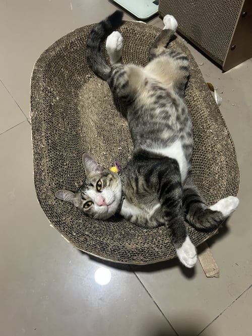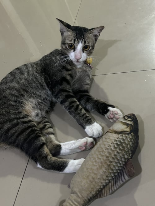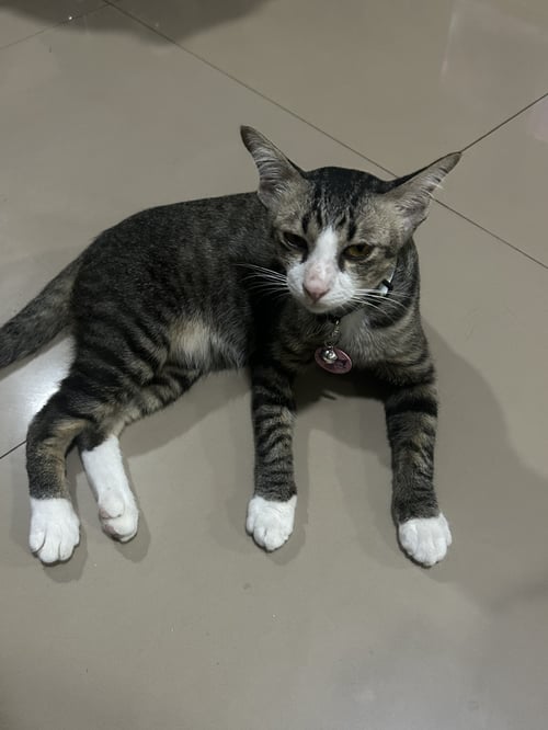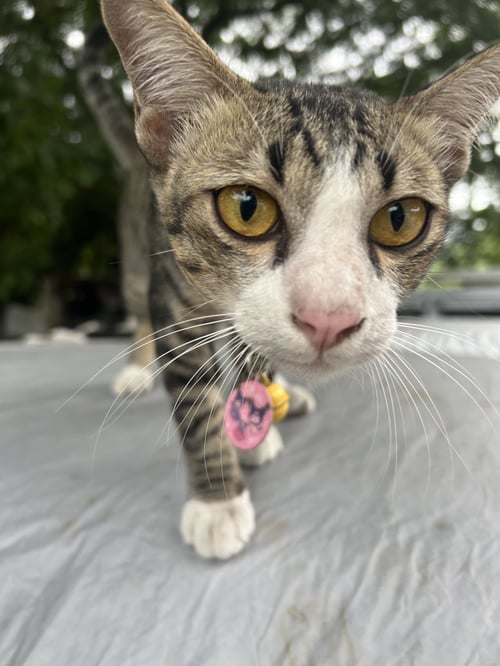 รอยตำหนิ: หน้ามีสีขาวเหมือนแรคคูน จมูกชมพู ฟันล่างเก ตัวป้อม ลายสลิดมีถุงเท้า 4 ข้าง ปลอกคอเรืองแสงห้องป้ายชื่อสีชมพูกระดิ่งสีเหลืองขี้เล่น ชอบร้องเรียก กินเยอะ ชอบให้เกาพุง ชอบกินไก่อบ เสียงเล็กๆ
