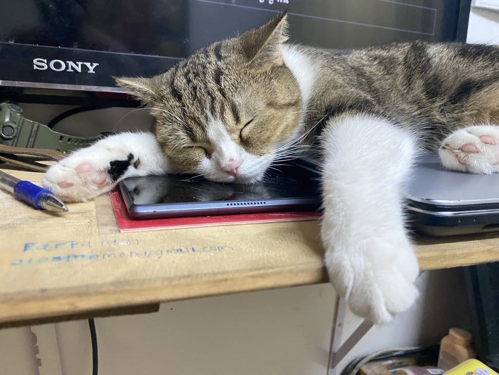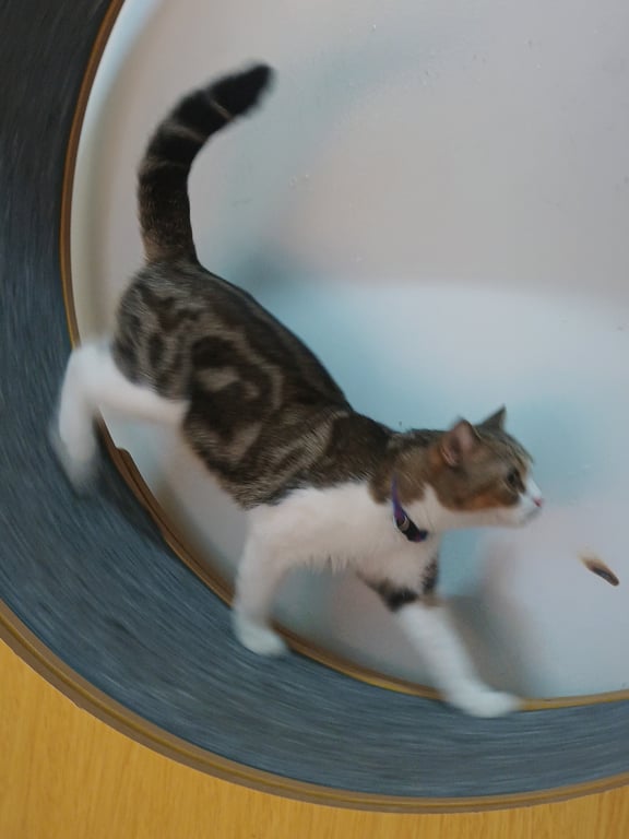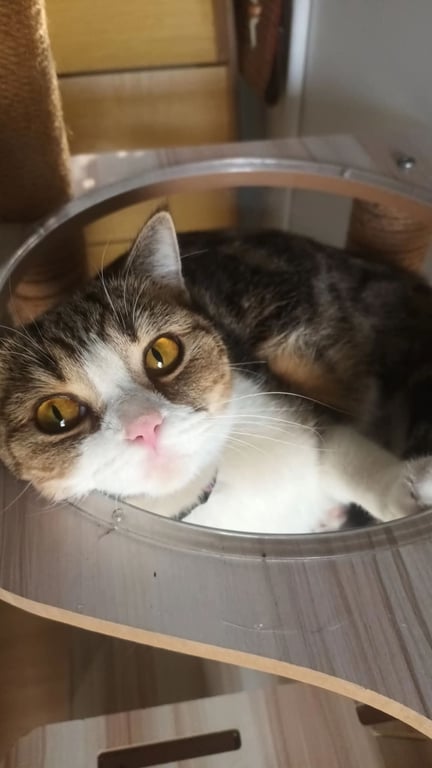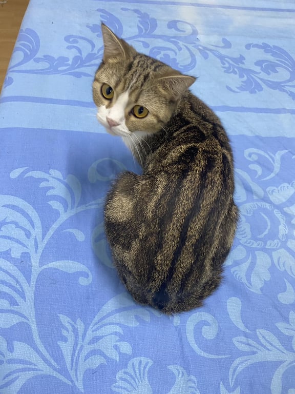 รอยตำหนิ: ลายที่ลำตัวชัด ตากลมโตสีเหลืองส้ม ใส่ถุงเท้าขาวยาวทั้งสี่ข้าง หางยาวลายเป็นป้อง ๆ ใส่ปลอกคอมีจี้ปลานีโม่สีแดง มีปานดำที่ฝ่าเท้าขวา มีไฝตรงหนวดแก้มซ้าย ที่จมูกซ้ายมีรอยแผลเป็นขี้กลัว เวลากลัวจะหมอบ เสียเล็กมาก ได้ยินเสียงถุงก๊อปแก๊ปรีบมาหา อ้อนกับคนที่คุ้นเคย