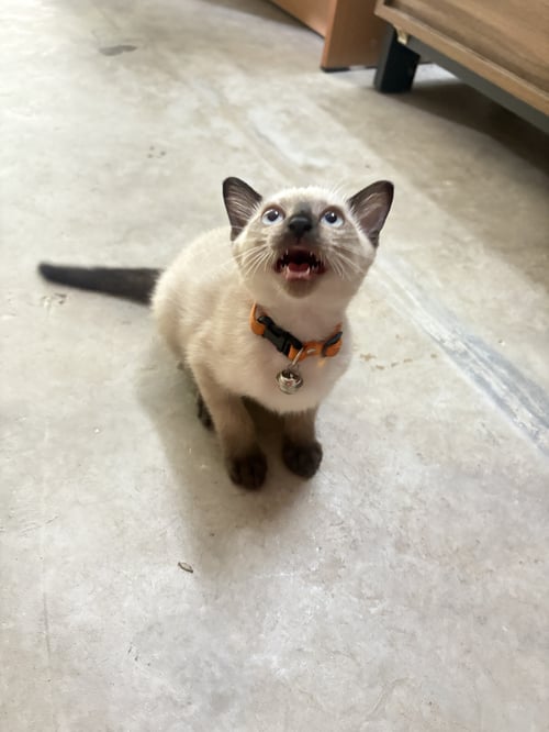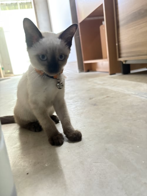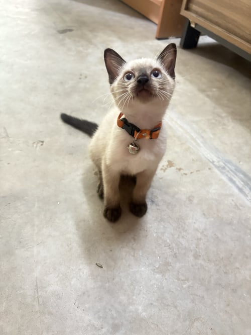 รอยตำหนิ: หน้าดำแมวประมาณสามเดือนขี้เล่นมีปลอกคอสีส้ม