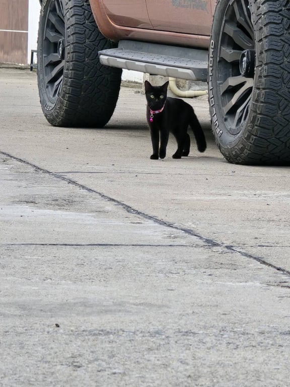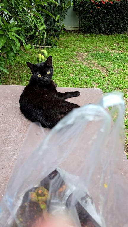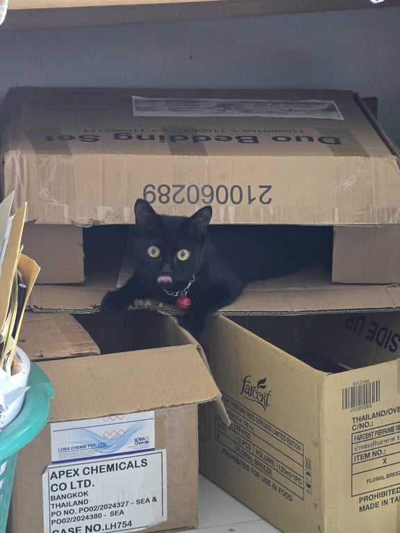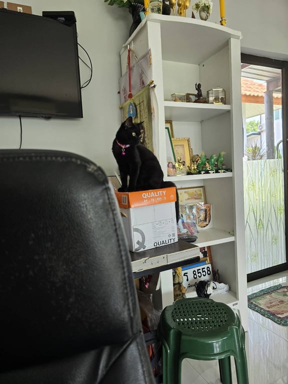 รอยตำหนิ: ดำสนิท มีแต่ตาที่เป็นสีเหลืองดำสนิท ตาสีเหลือง เป็นแมวไทย ปลอกคอสีชมพู