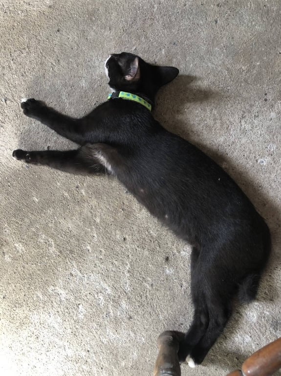 สีดำ ปากขาว เท้าขาว ตาสีเหลือง หูตั้ง มีปอดคอสีเขียว กระดิ่งสีเขียว