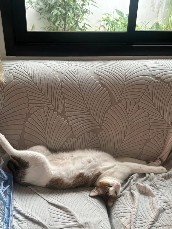 รอยตำหนิ: ผมแสกกลาง มีลายวงกลมใหญ่ที่ขาหน้าขวาติดคน ไม่ดุ ชอบนอน