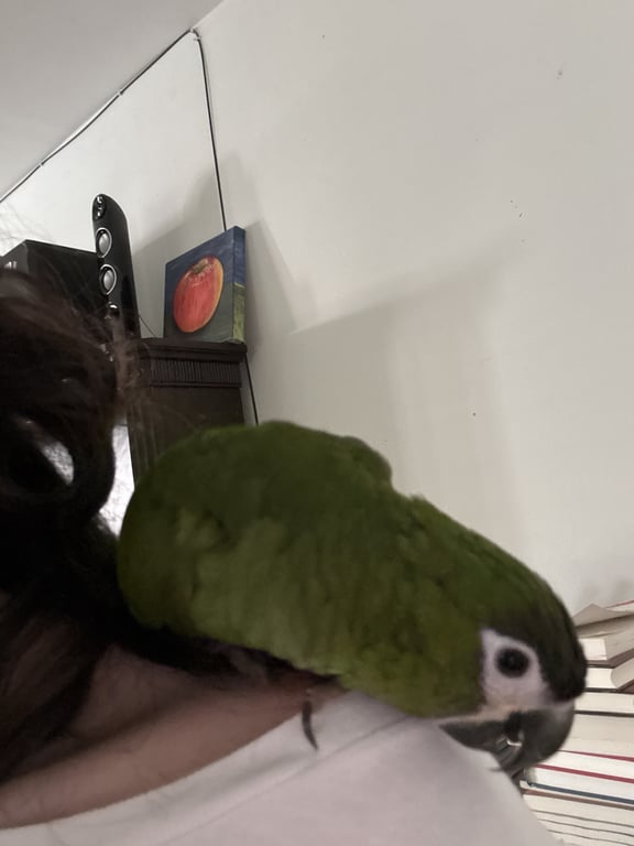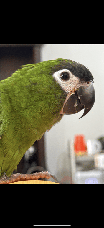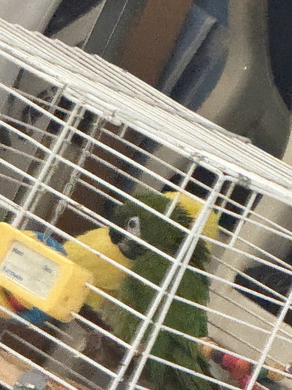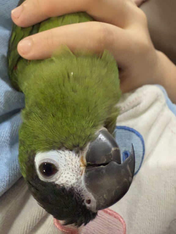 รอยตำหนิ: OnnutThis bird is a red winged macaw. The size of it is small and not large like a regular macaw. It has green wings with tinted red hue to it. Its face is white with little specks of hair to it. This bird can say “hello”, “mama”, and its own name which is in Chinese. The bird is still young, at an estimated age of one year old.