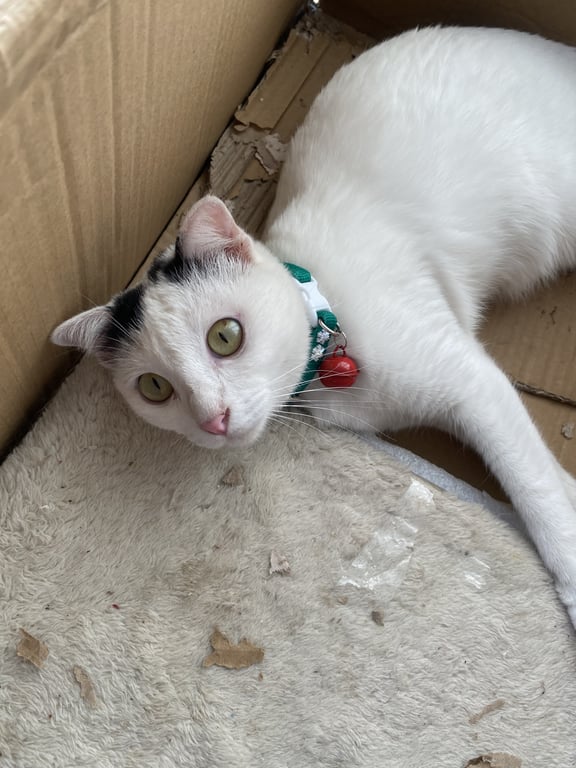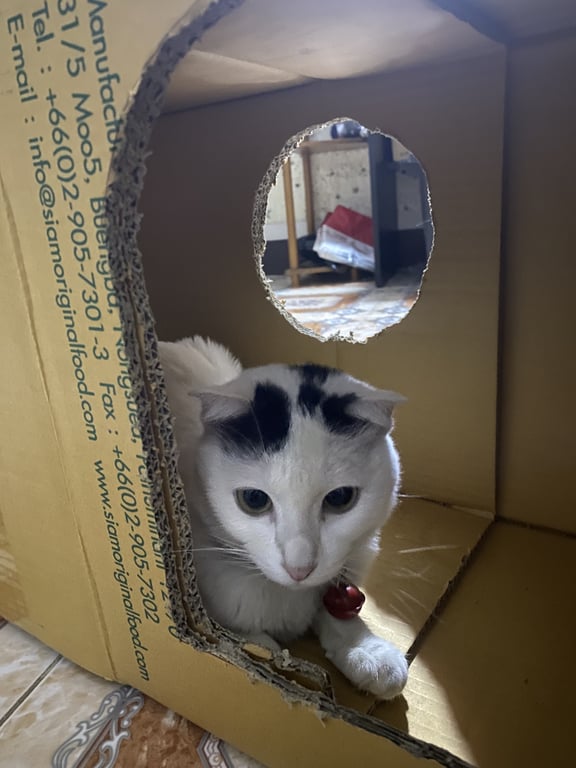 รอยตำหนิ: หางดำ จุดที่หัว กับ กลางหลังชื่อกะทิ สก็อตติชผสมไทย เรียกกะทิ เขาจะตอบรับ ขี้อ้อน ชอบคน ปลอกคอสีเขียวกระดิ่งสีแดง