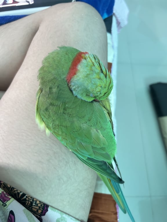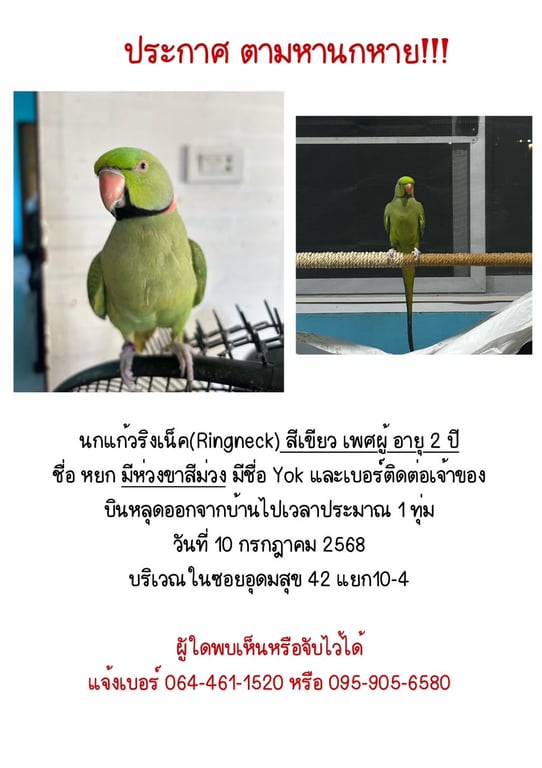 รอยตำหนิ: มีห่วงขาสีม่วง มีชื่อนก(Yok)และเบอร์โทรเจ้าของอยู่ขี้กลัว ตื่นคน