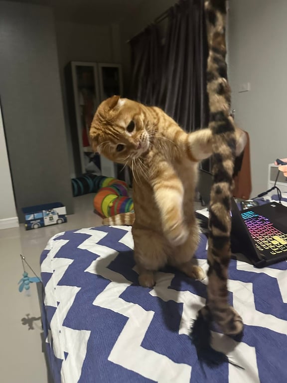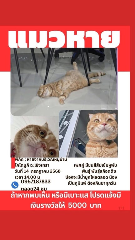 รอยตำหนิ: แมวหูพับสีส้มเข้ม น้องน้ำน้องน้ำมูกไหลตลอดเวลา น้องเป็นภูมิแพ้น้องแมวนิสัยขี้กลัวมากไม่ดุ แต่น้องจะคัดจมูกมีน้ำแต่น้องจะคัดจมูกมีน้ำมูกตลอด น้องเป็นแมวสีส้มเข้ม