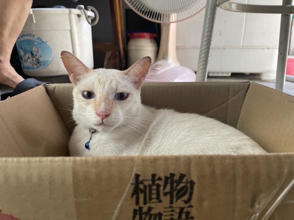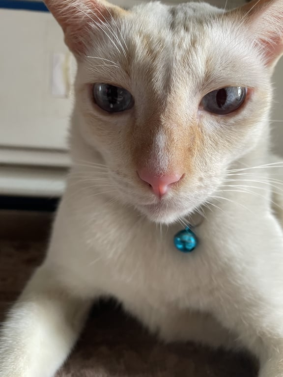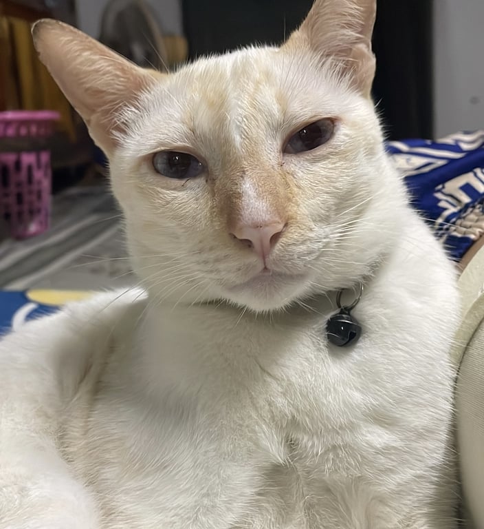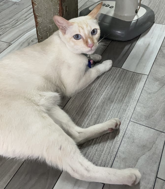 รอยตำหนิ: ขนออกสีขาวครีม หูแหว่ง จมูกสีน้ำตาล ตาสีฟ้า ปลอกคอสีน้ำเงินกลัวคน วิ่งหนีไว แต่อยู่แถวบริเวณบ้านชอบขู่กับตัวอื่น