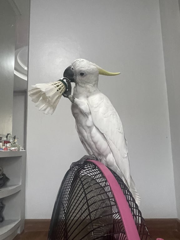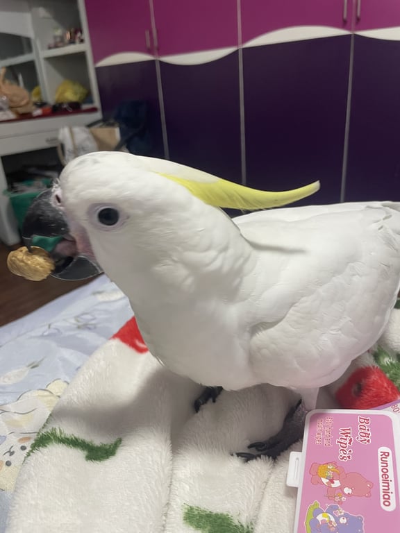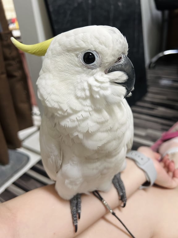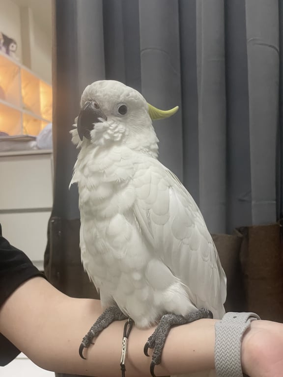 รอยตำหนิ: มีหวงขาข้างซ้าย เขียนวว่า TKนกกระตั้วหงอนสีเหลือง พันธุ์มีเดียม ที่กลัว ไม่กล้าเข้าใกล้คนแปลกหน้า