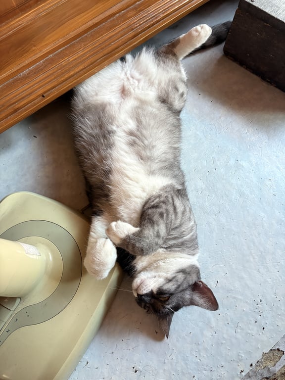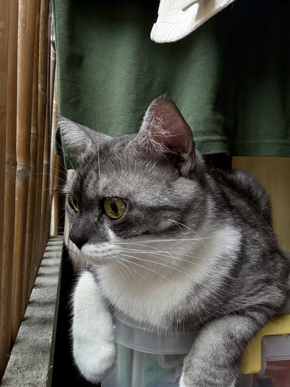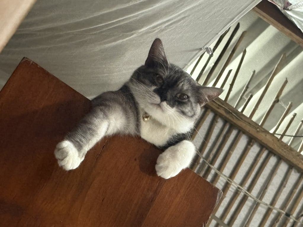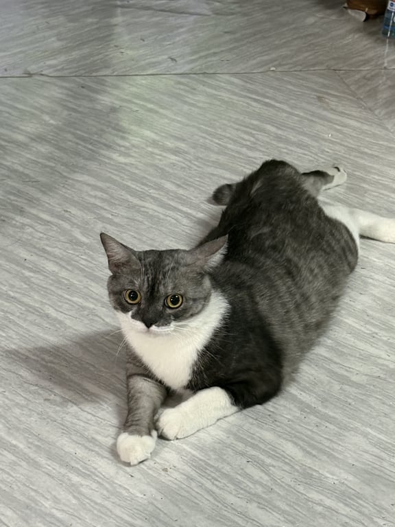 รอยตำหนิ: มีถุงเท้าสีขาว 4 ข้าง ถุงเท้าสีขาวข้างขวาจะยาวขึ้นมา อุ้งมือสีดำ ท้องสีขาว บริเวรหน้าครึ่งล่างสีขาว ข้างบนสีเทาดำเป็นแมวไม่ค่อยร้อง แมวเงียบๆ