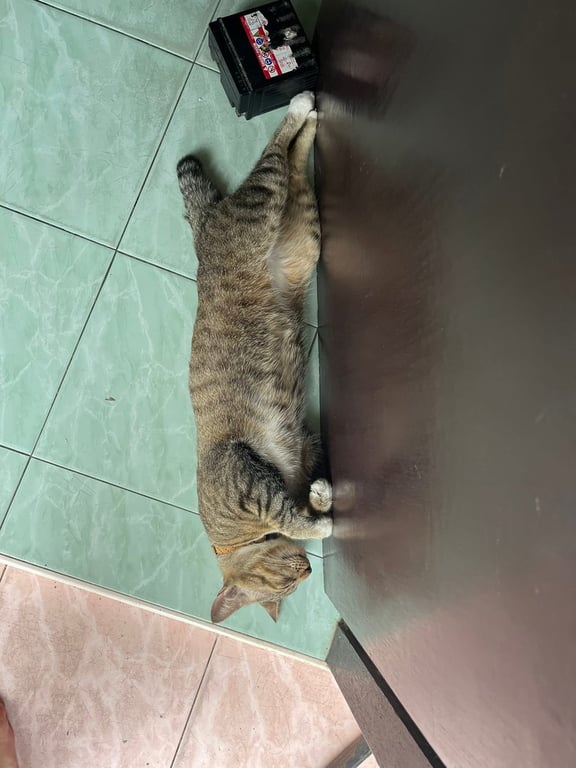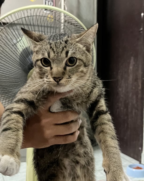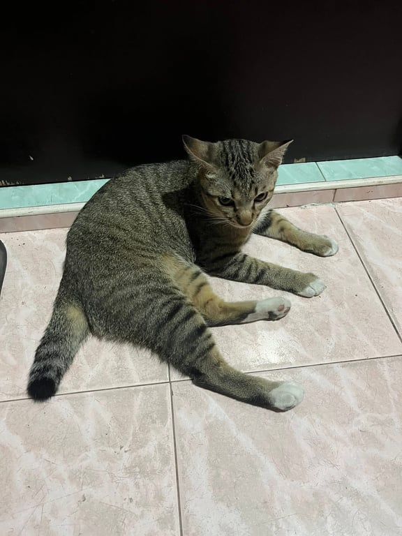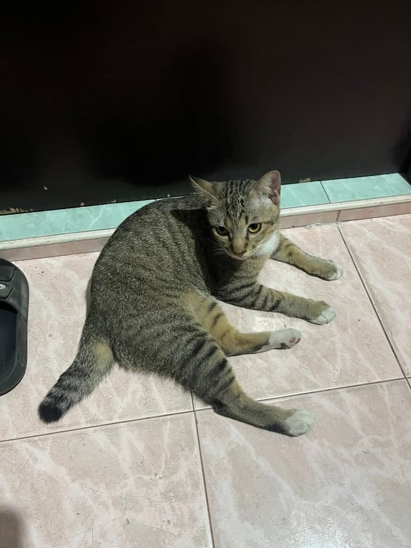 รอยตำหนิ: ลายสลิด หางสั้น มีสีขาวที่เท้า4ขา ปลอกคอสีส้มตัวจะอ้วน ๆ ไม่กลัวคน