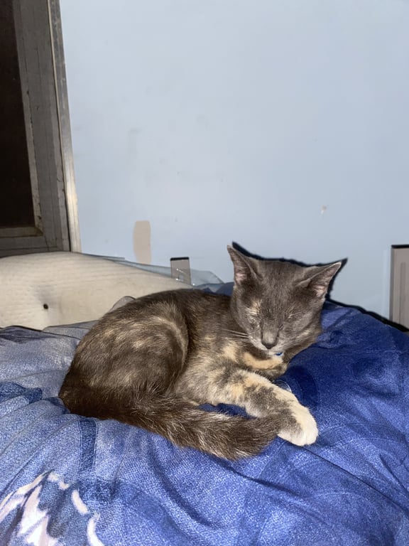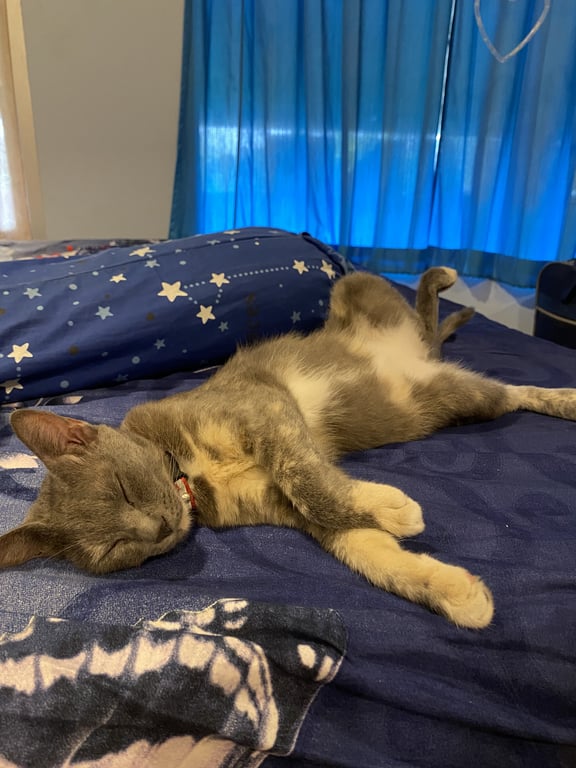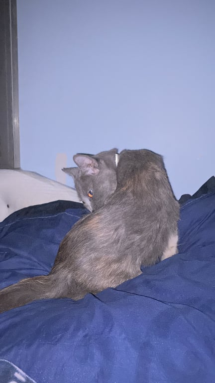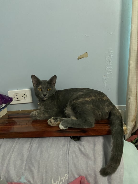 รอยตำหนิ: ตาสีเหลือง ตัวสีเทาเปรอะน้องไม่ค่อยให้คนแปลกหน้าจับ ตัวสีเทาเปรอะ ตาสีเหลือง ใส่ปลอกคอสีแดงมีกระดิ่ง หายเพราะย้ายบ้านแล้วน้องไม่ชินที่ แอบเปิดหน้าต่างหนีไป