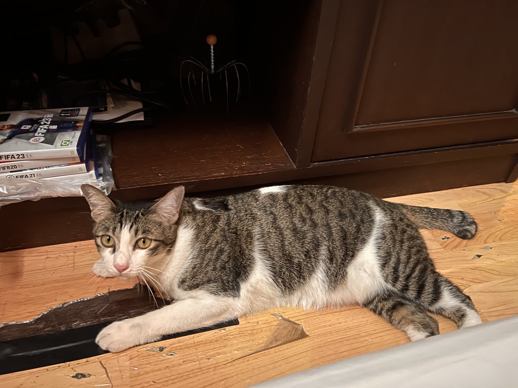 รอยตำหนิ: หางตัด ท้องขาว หลังลายสลิดอุ้มชอบกางเล็บ ชอบให้เกาคาง ตัวอ้วน