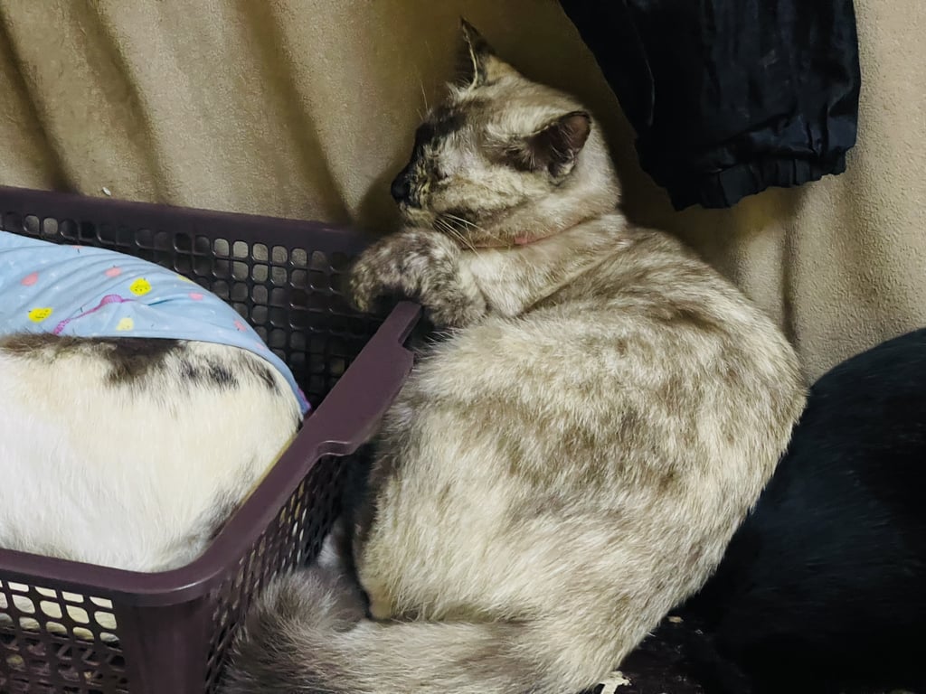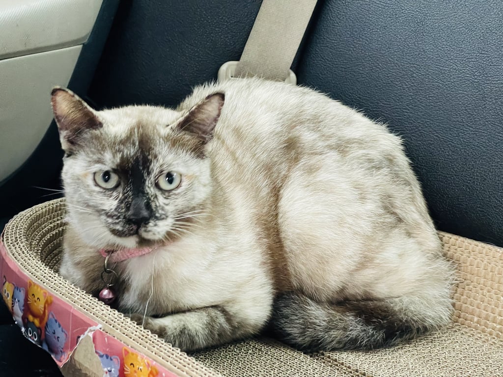 รอยตำหนิ: สีเปรอะ ใต้คางแบ่งสีขาวกับน้ำตาลตัวอ้วนกลม ชอบขึ้นรถ กินเก่ง ขนสีเปรอะ