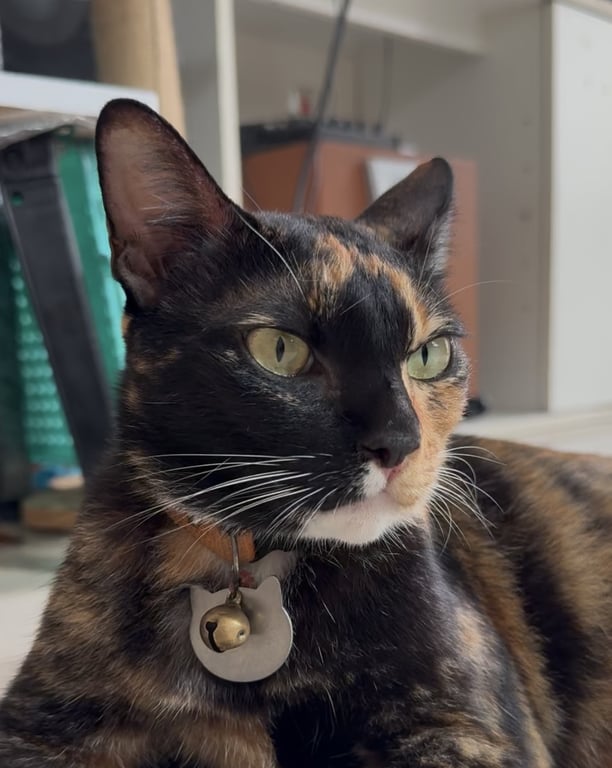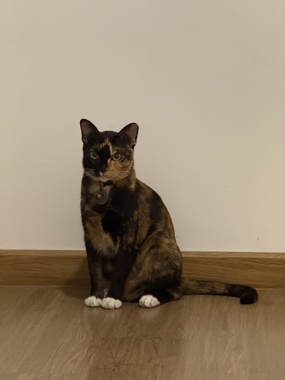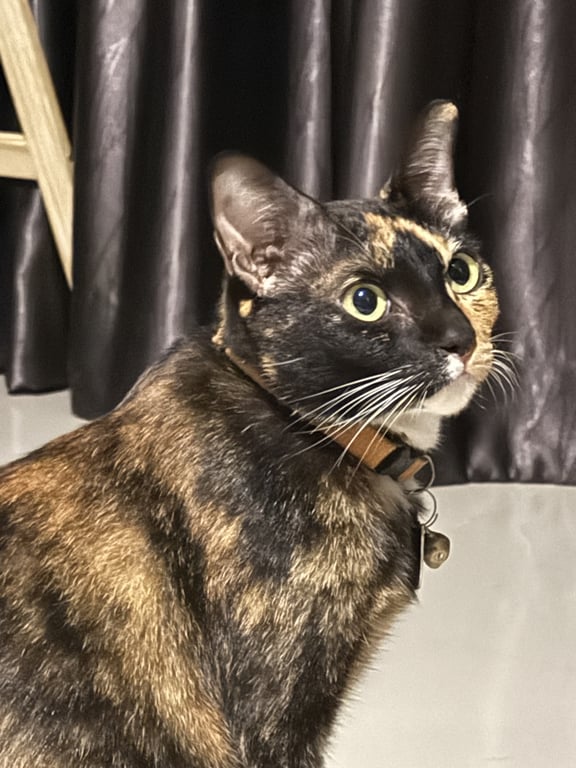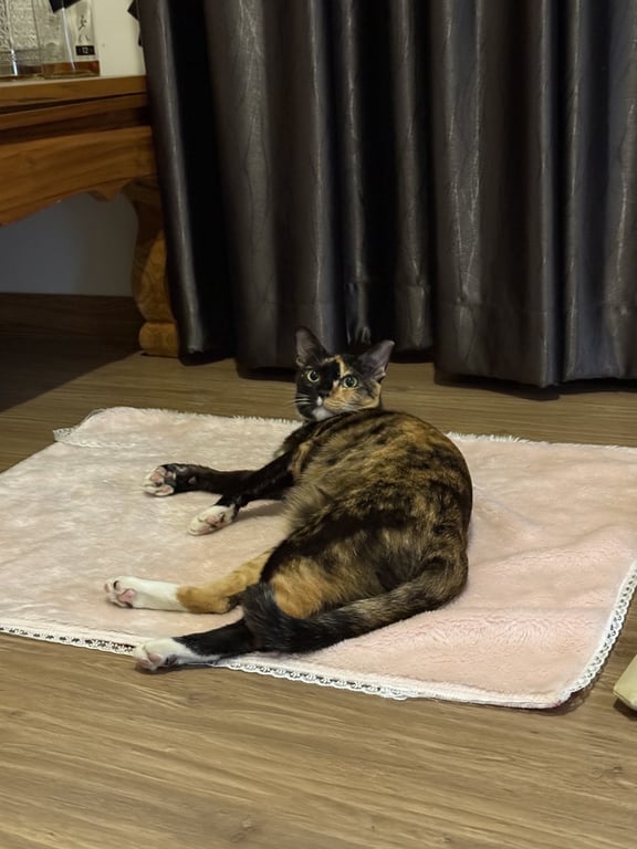 รอยตำหนิ: แมวสามสี/สีเปรอะ หูซ้ายแหว่งนิดๆ เท้าขาวแบบใส่ถุงเท้าทั้ง4เท้าขี้กลัวระแวงคนแปลกหน้า เวลาจะเรียกเขาต้องใช้ปลาเส้นทาโร่ขยำถุงล่อเขาขอบกินมาก