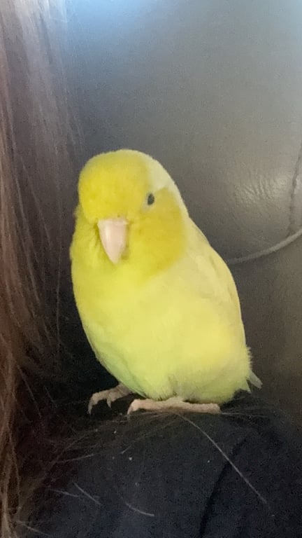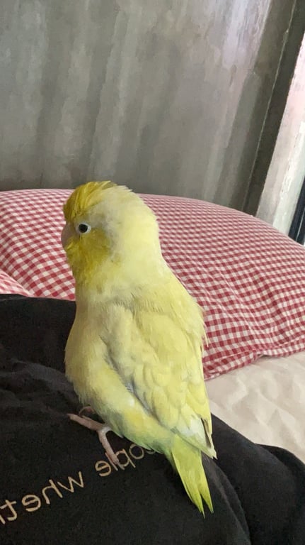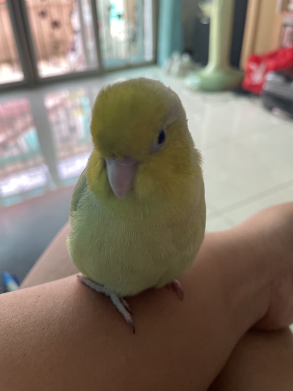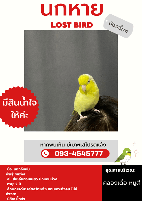 รอยตำหนิ: สีเหลืองอมเขียวปีกแซมสีม่วงชอบเกาะหัวคน ไม่ให้จับตัว ร้องเสียงเป็นเอกลักษณ์