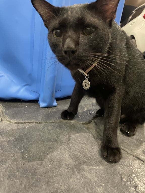 รอยตำหนิ: ฟันหน้าด้านขวาบิ่น ขนหงอกขี้อ้อนมาก ไม่กลัวคน ตอนนอนชอบพับแขนหน้า