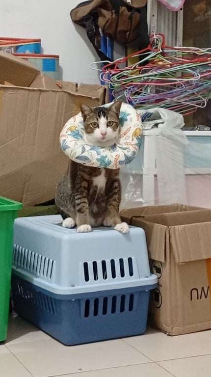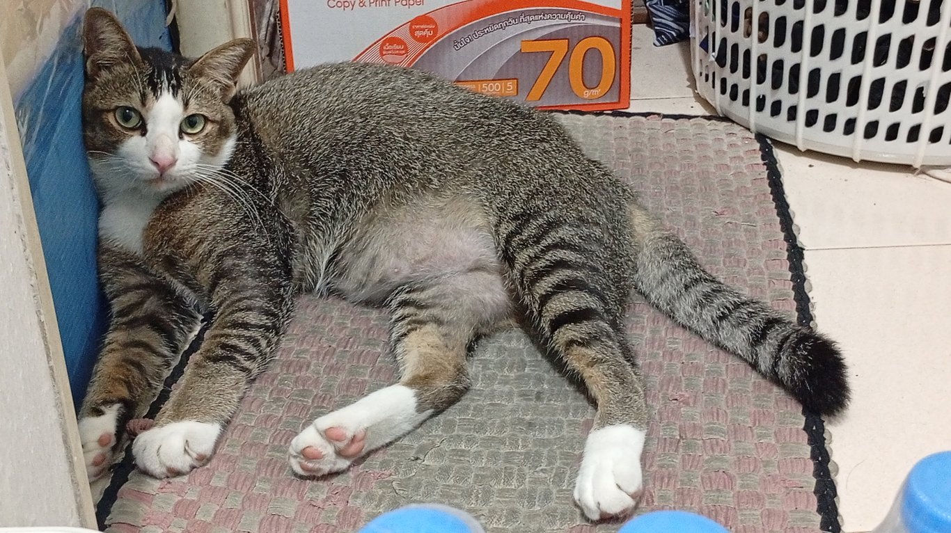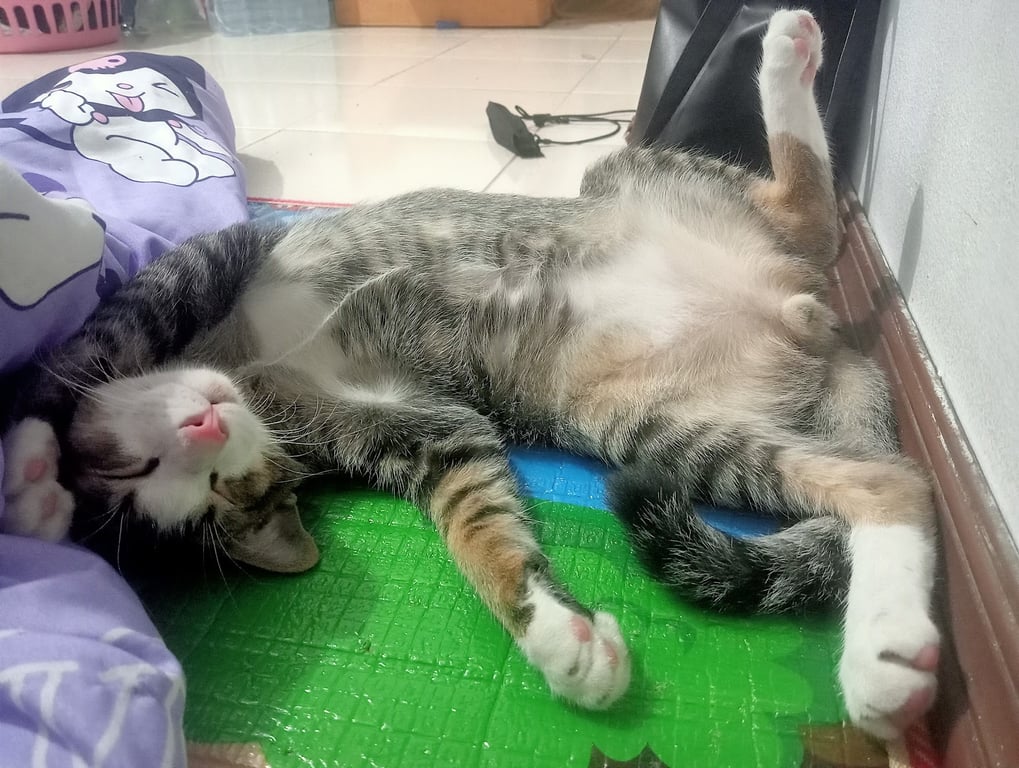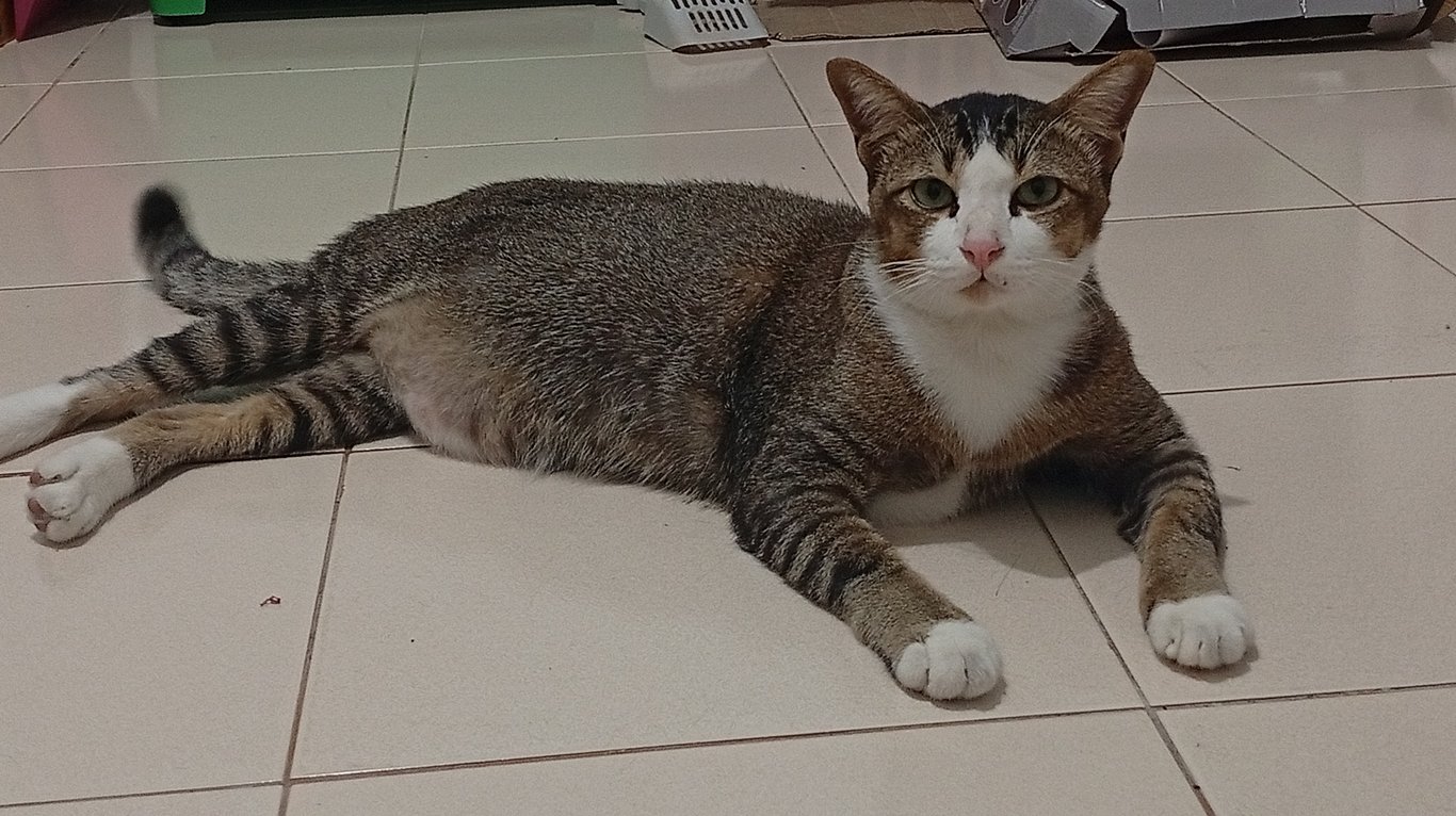รอยตำหนิ: ปลายหางงอ ลายสลิดเหมือนสวมเสื้อคลุม หน้า+คอขาว อุ้งเท้าข้างนึงมี2สีเป็นแมวขี้เล่น แต่ก็ขี้กลัว พุงย้อยๆ นอนทั้งวัน
