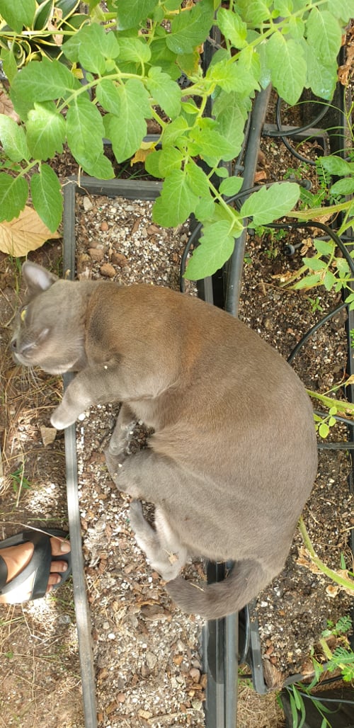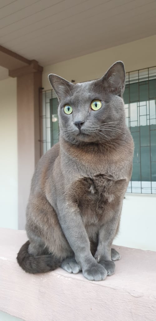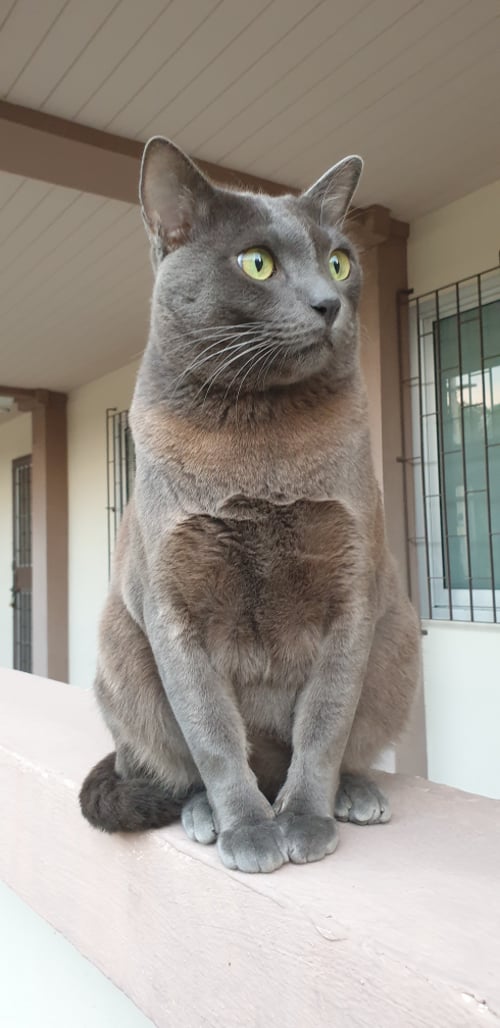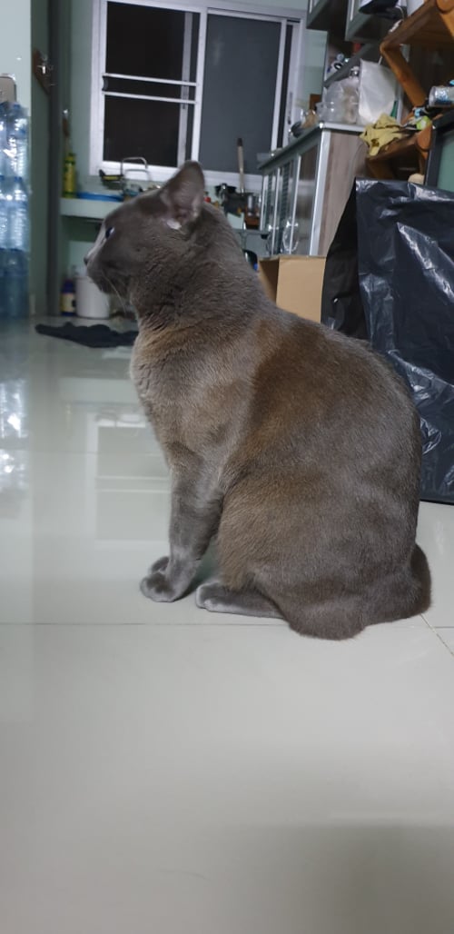 รอยตำหนิ: หางหักที่โคนหาง เปลือกตาบนด้านซ้ายเป็นเส้นเหมือนรอยเล็บแมวตัวใหญ่ เขี้ยวใหญ่ ข้กลัว แต่ชอบขึ้นรถ น้องจรมา เลยเลี้ยงผสมแบบเปิดและปิด ปกติจะกลับบ้านเอง มาอยู่ด้วยกัน ก.ย. 63 แต่ไปหาหมอและให้ช่วยประเมินอายุ เมื่อ 63 หมอบอก ประมาณ 4 ปีแล้ว ตอนนี้ น่าจะเริ่มมีปัญหาที่ขา เพราะน้ำหนักมาก 7.1 กก.