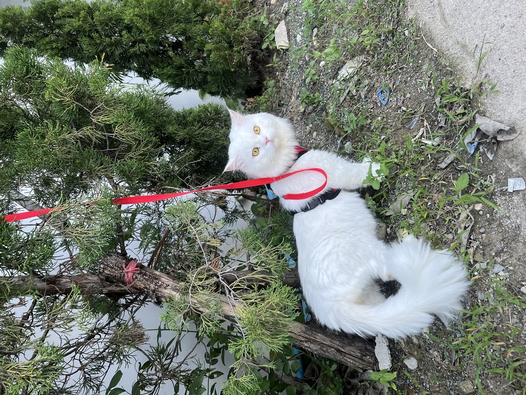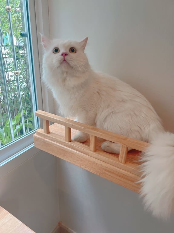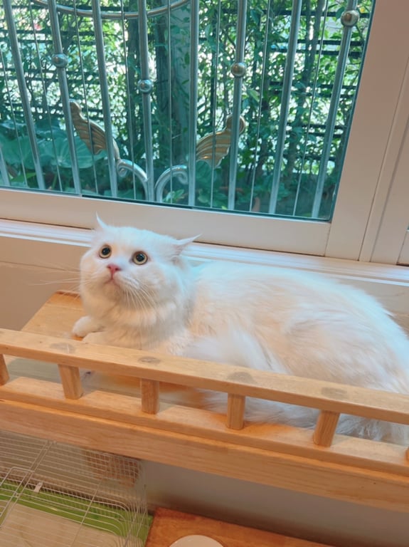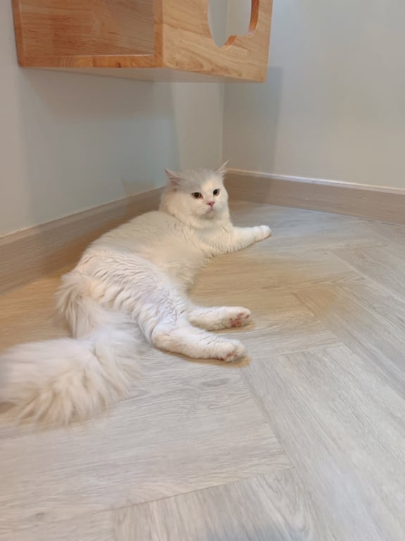 รอยตำหนิ: มีขนสีดำแซมนิดๆตรงหน้าผาก มีรอยตัดขนตัวสีขาวล้วน เพศผู้ โครงใหญ่ ตาสีเหลือง