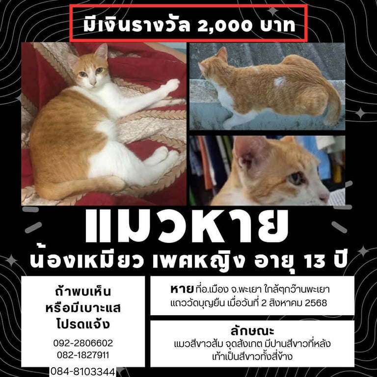 รอยตำหนิ: มีลายจุดสีขาวบนหลังน้องกลัวคนแล้วก็กลัวแมวตัวอื่นที่ไม่ได้อยู่ในบ้านเดียวกันมากๆ ขยับตัวน้อยแต่ชอบเดินเล่น