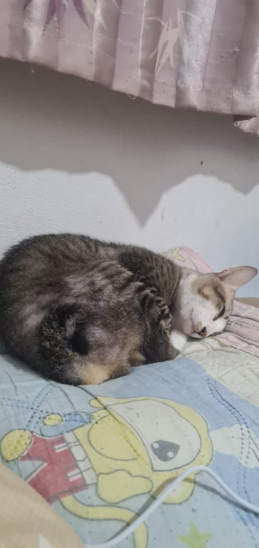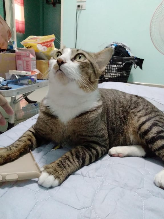 รอยตำหนิ: หางคต งอม้วนเป็นแมวสีสลิด หน้าขาว ตรงอกมีสีขาว กับตรงข้อเท้ามีสีขาว หางคต เป็นแมวติดคน ขี้อ้อน ชินคน