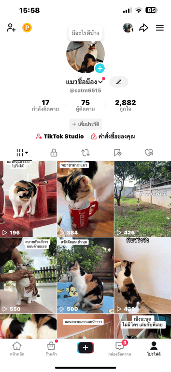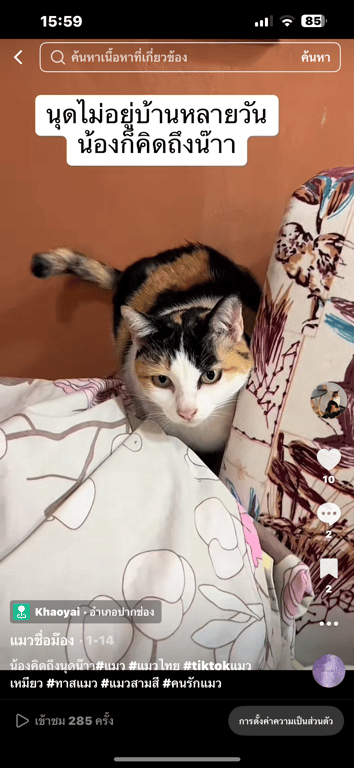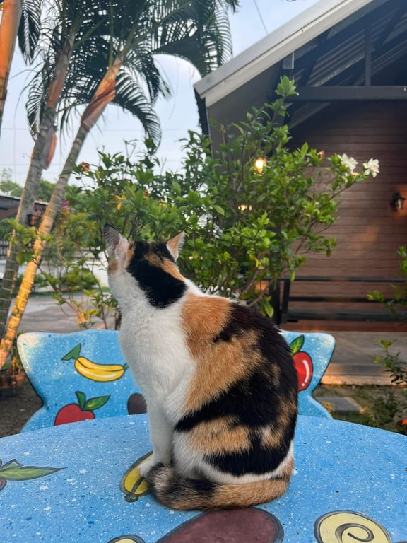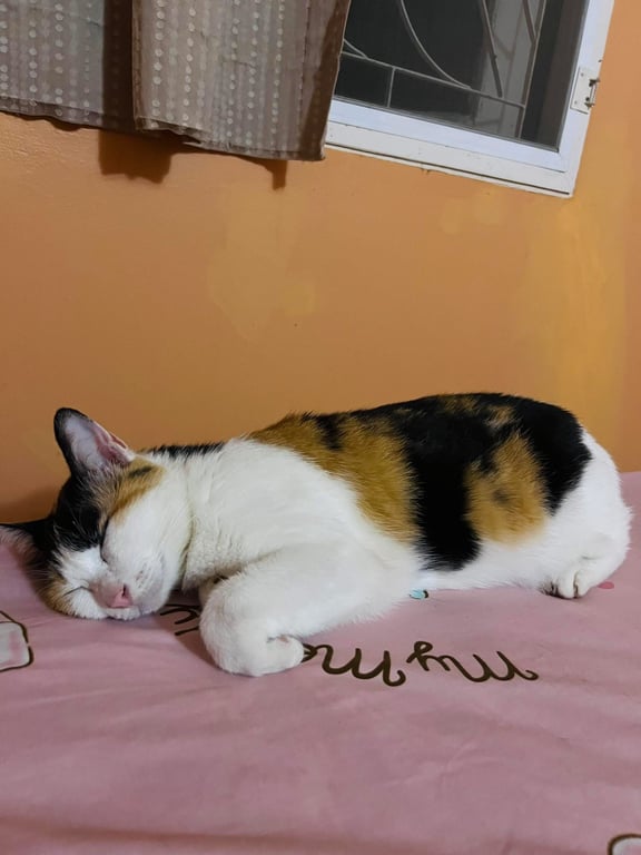 รอยตำหนิ: แมวสามสี ปลายหางจะงอเล็กน้อย หน้าผากมีเส้นขาวผ่ากลาง ลายสามสีเข้มและชัดมากเข้ากับคนง่าย ถ้ายังไม่สนิทจะค่อนข้างเก็บตัว ร่าเริง ชอบเล่น ใกล้ชิดเจ้าของไม่ค่อยห่าง นอนกับเจ้าของตลอด ***คนข้างบ้าน จับไปปล่อย ห่างจากบ้าน ***