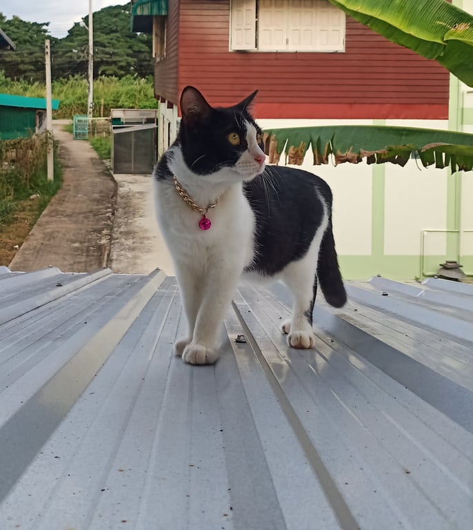 น้องสีขาวดำ มีปลอกคอโซ่สีทอง กระดิ่งสีชมพู