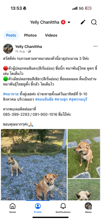 รอยตำหนิ: ปลอกคอสีแดง หูตก ขี้เล่น ตัวโตเต็มไว อายุ 3 ขวบขี้เล่น ใจดี เข้ากับคนง่าย ขอมือได้