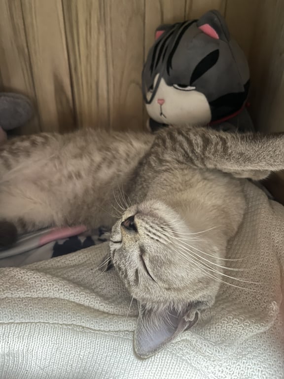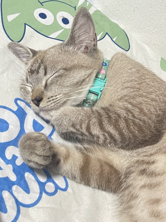 รอยตำหนิ: ตรงกลางจมูกเป็นสีชมพูค่อนข้างขี้กลัว ไม่ดุร้าย อ้วน ใส่ปลอกคอสีเขียวมิ้น