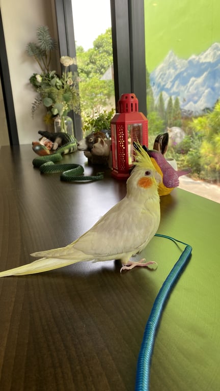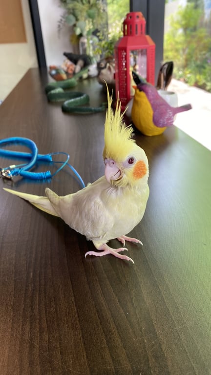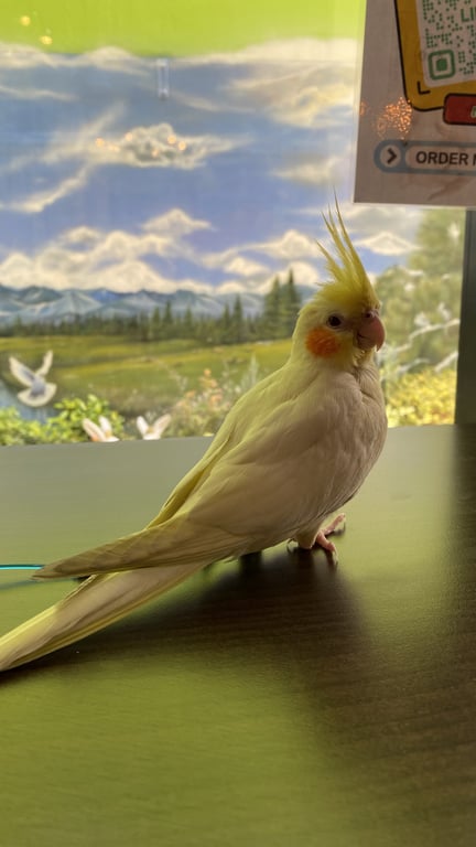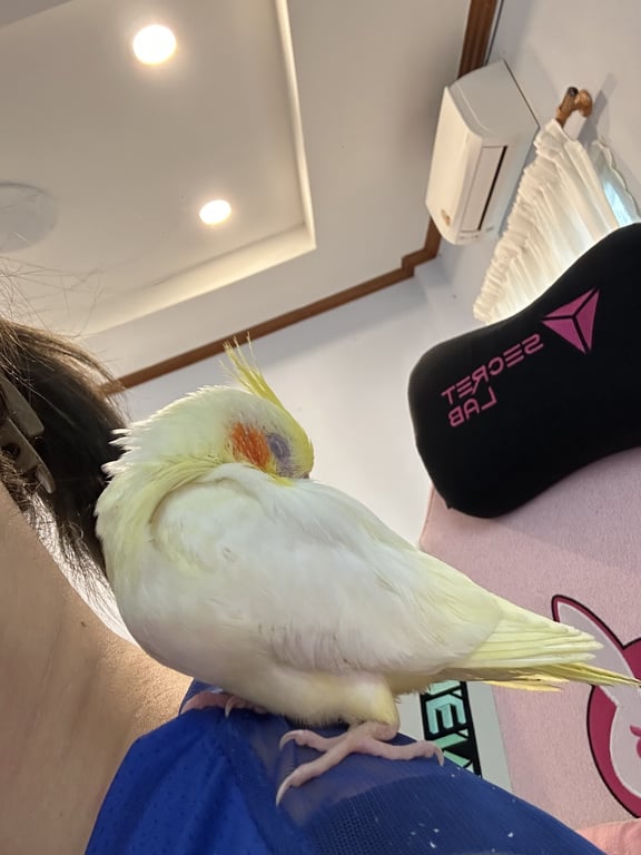 รอยตำหนิ: ปลายปีกสีคล้ำนิดหน่อยไม่มากถ้าไม่สังเกตุที่ขามีห่วงสลักเบอร์โทรอยู่ค่ะ สีเงิน ติดคนมาก แต่ขี้ตกใจ ร่าเริง ขอ ตัวสีเหลืองแก้มส้มแดงใหญ่สังเกตุง่าย